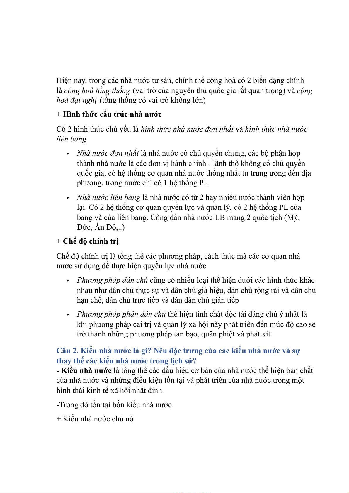 Câu 2. Kiểu nhà nước là gì? Nêu đặc trưng của các kiểu nhà nước và sự