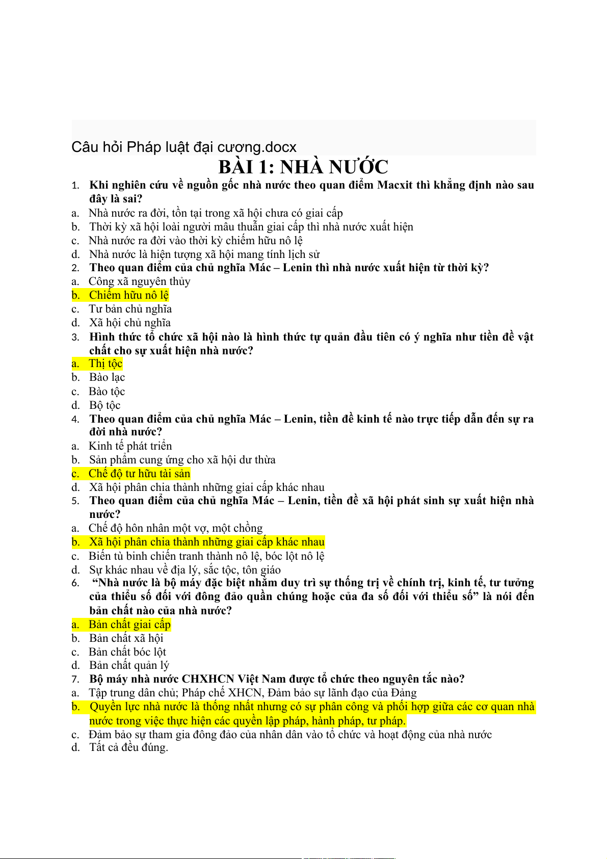 Câu hỏi Pháp luật đại cương.docx BÀI 1: NHÀ NƯỚC 1.