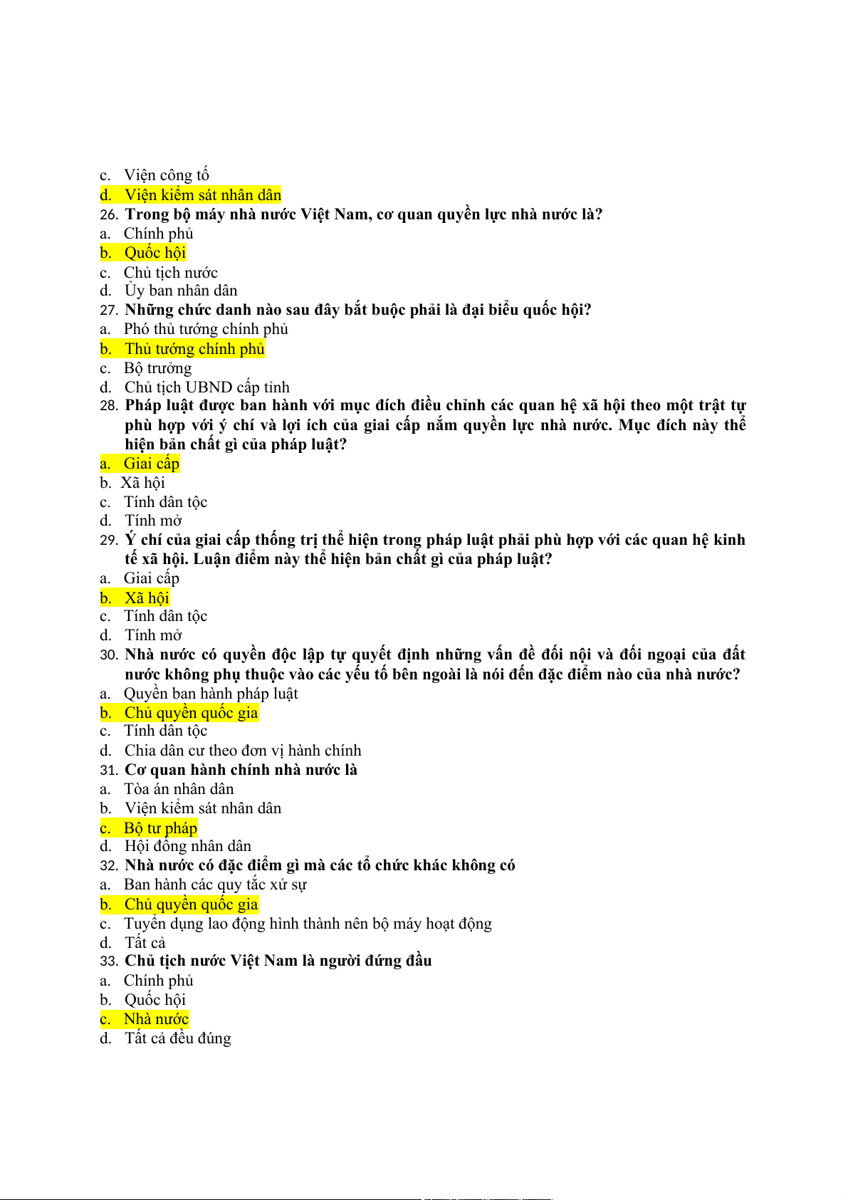 33. Chủ tịch nước Việt Nam là người đứng đầu a. Chính phủ b. Quốc hội c. Nhà nước d. Tất cả đều đúng