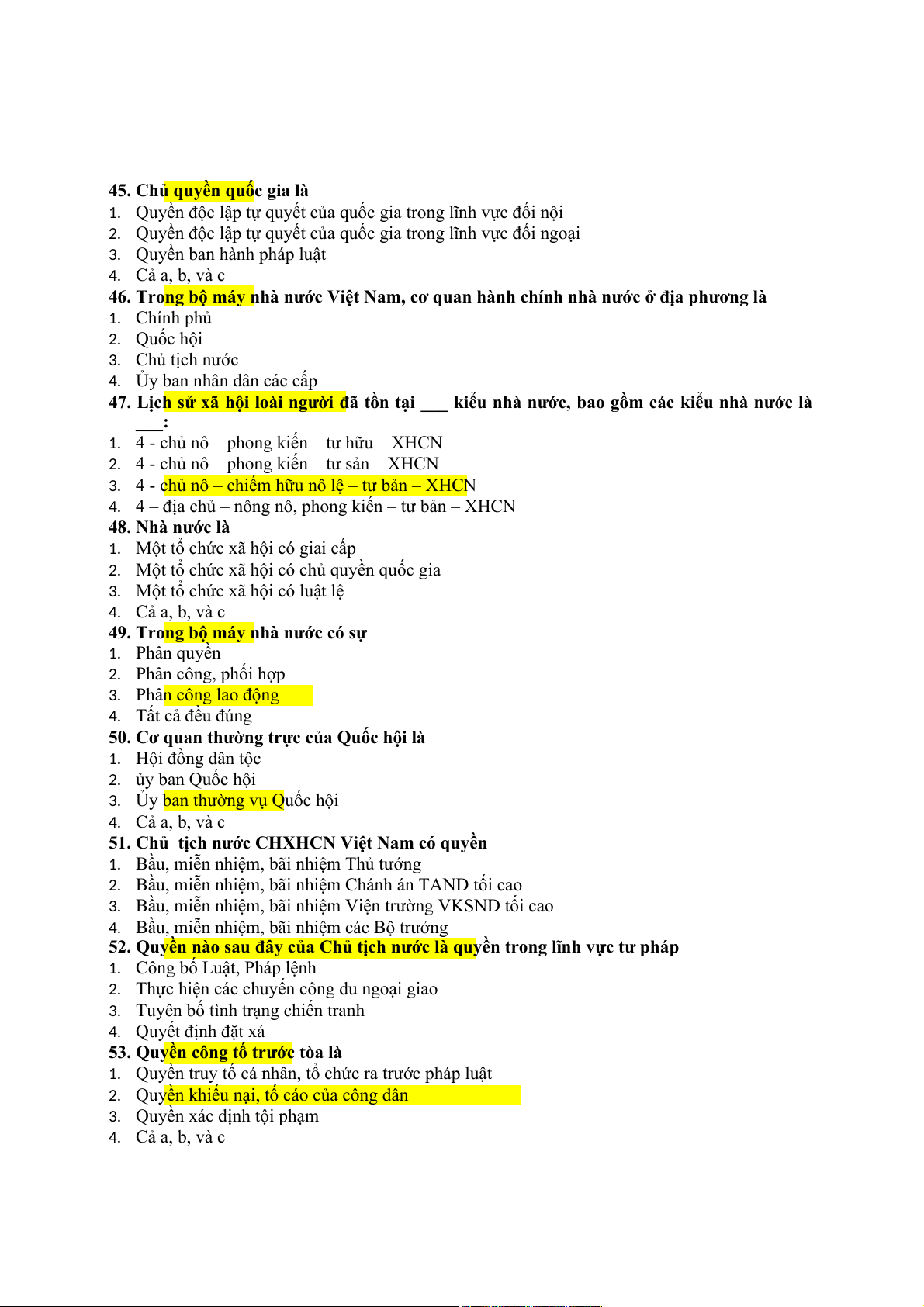 c. Cơ quan quyền lực, cơ quan quản lý nhà nước, cơ quan xét xử, cơ quan kiểm sát d. Tất cả đều đúng