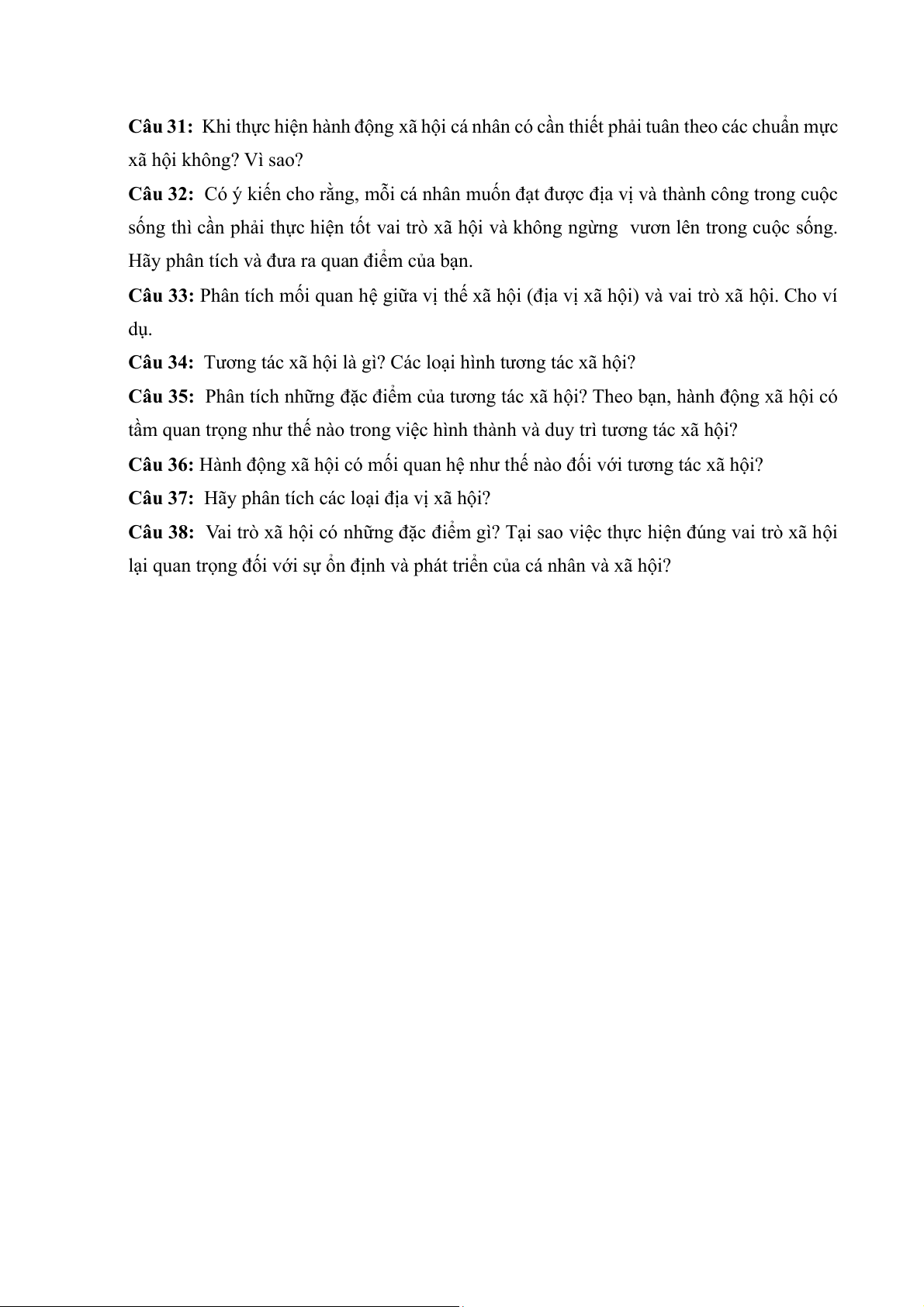 Câu 31: Khi thực hiện hành động xã hội cá nhân có cần thiết phải tuân theo các chuẩn mực xã hội không? Vì sao?