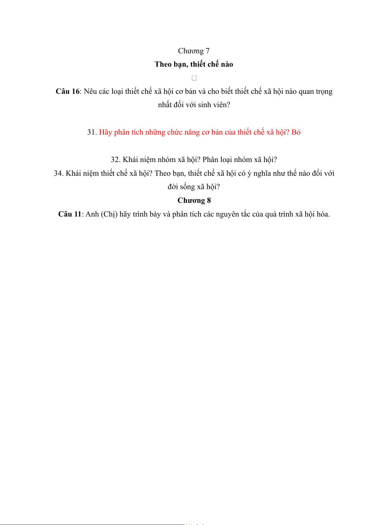 Câu 28: Thiết chế xã hội có những chức năng cơ bản nào? Hãy phân tích và cho biết tại