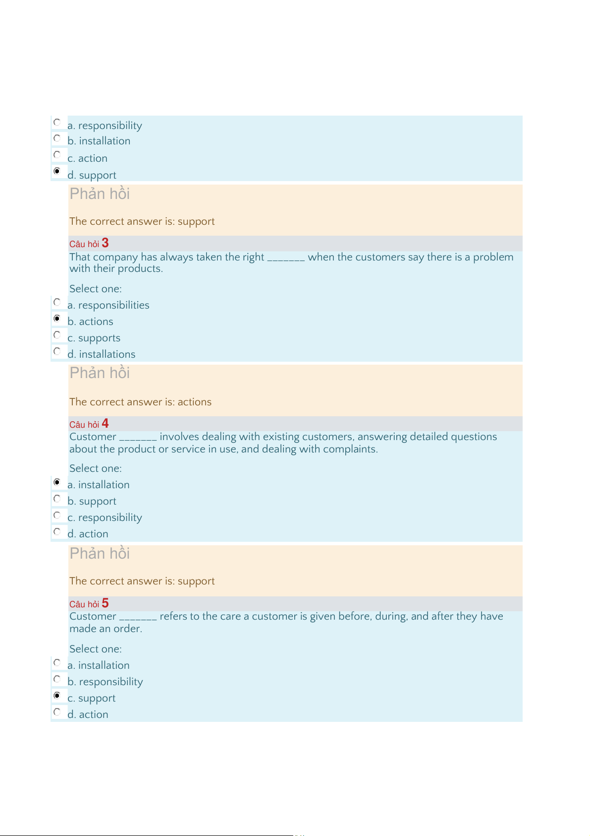 about the product or service in use, and dealing with complaints. Select one: a. installation b. support c. responsibility d. action Phản hồi