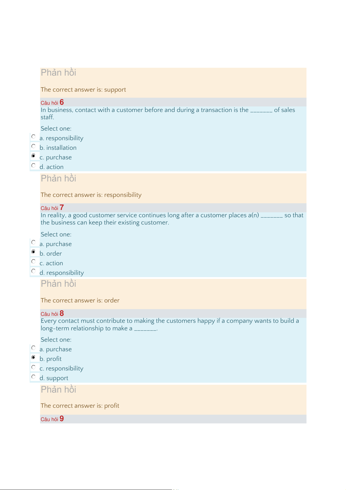 the business can keep their existing customer. Select one: a. purchase b. order c. action d. responsibility Phản hồi The correct answer is: order Câu hỏi 8