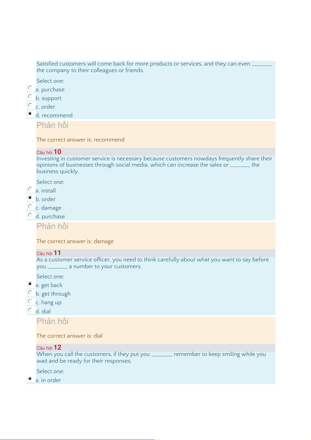 you _______ a number to your customers. Select one: a. get back b. get through c. hang up d. dial Phản hồi The correct answer is: dial Câu hỏi 12