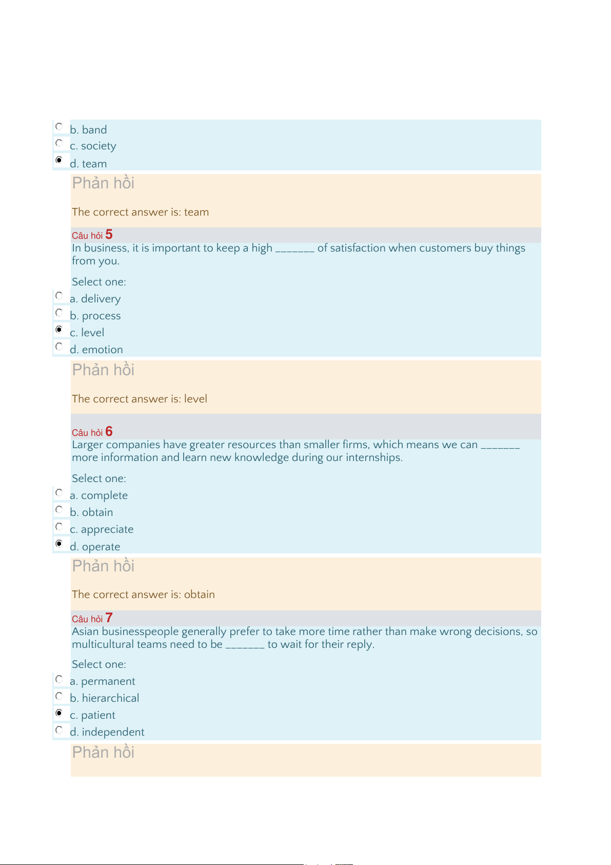 more information and learn new knowledge during our internships. Select one: a. complete b. obtain c. appreciate d. operate Phản hồi The correct answer is: obtain Câu hỏi 7