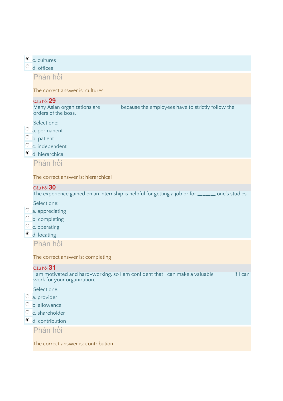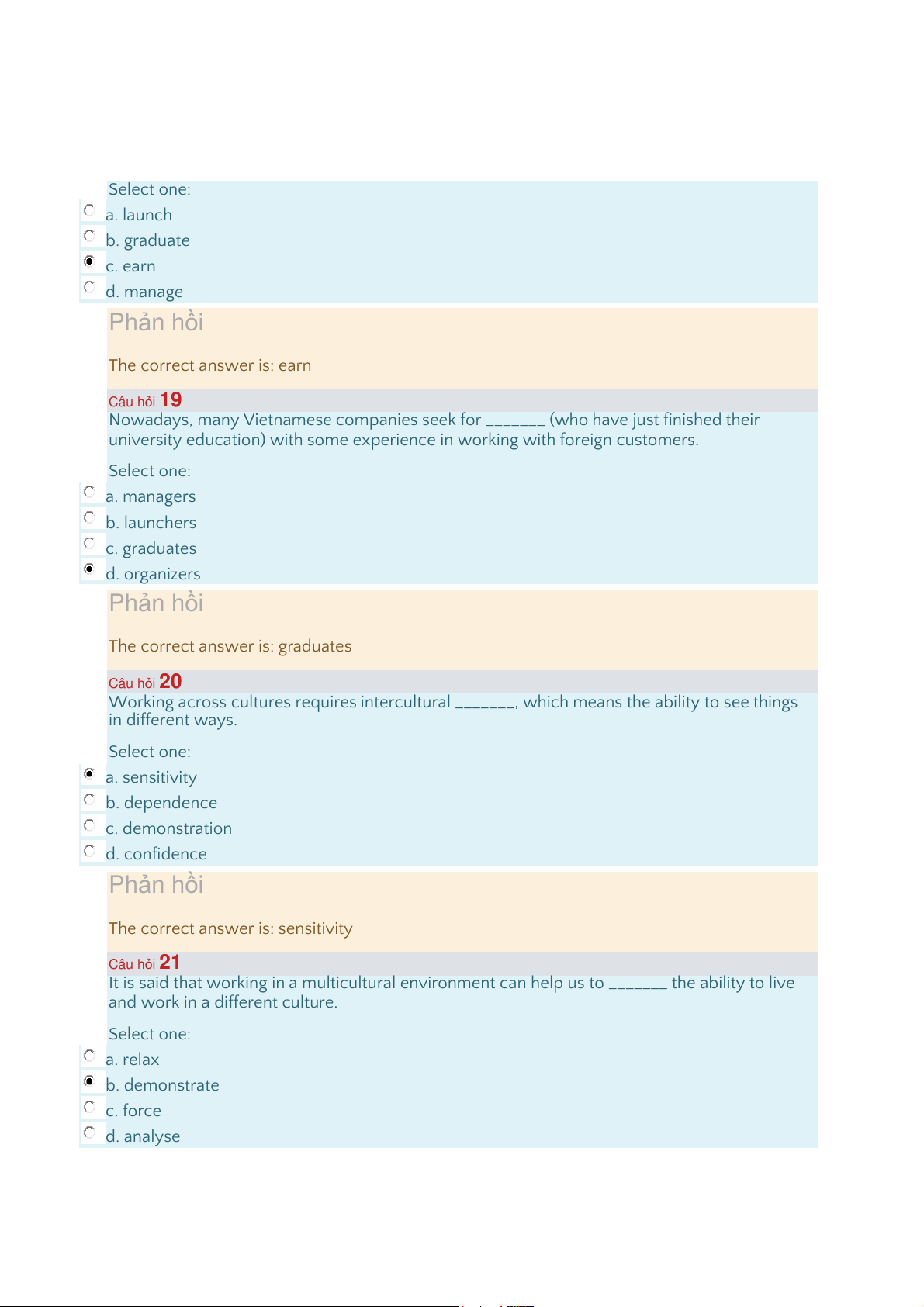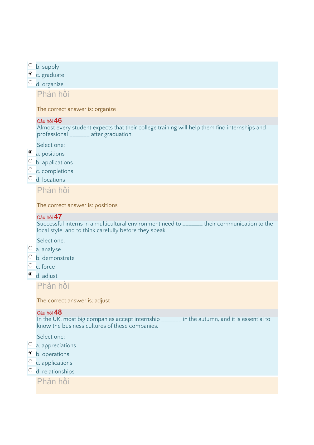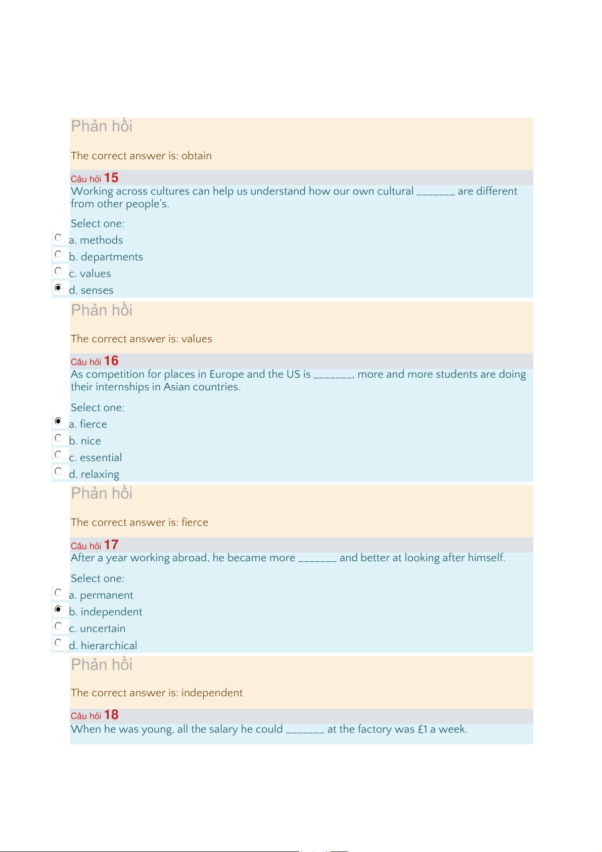 their internships in Asian countries. Select one: a. fierce b. nice c. essential d. relaxing Phản hồi The correct answer is: fierce Câu hỏi 17
