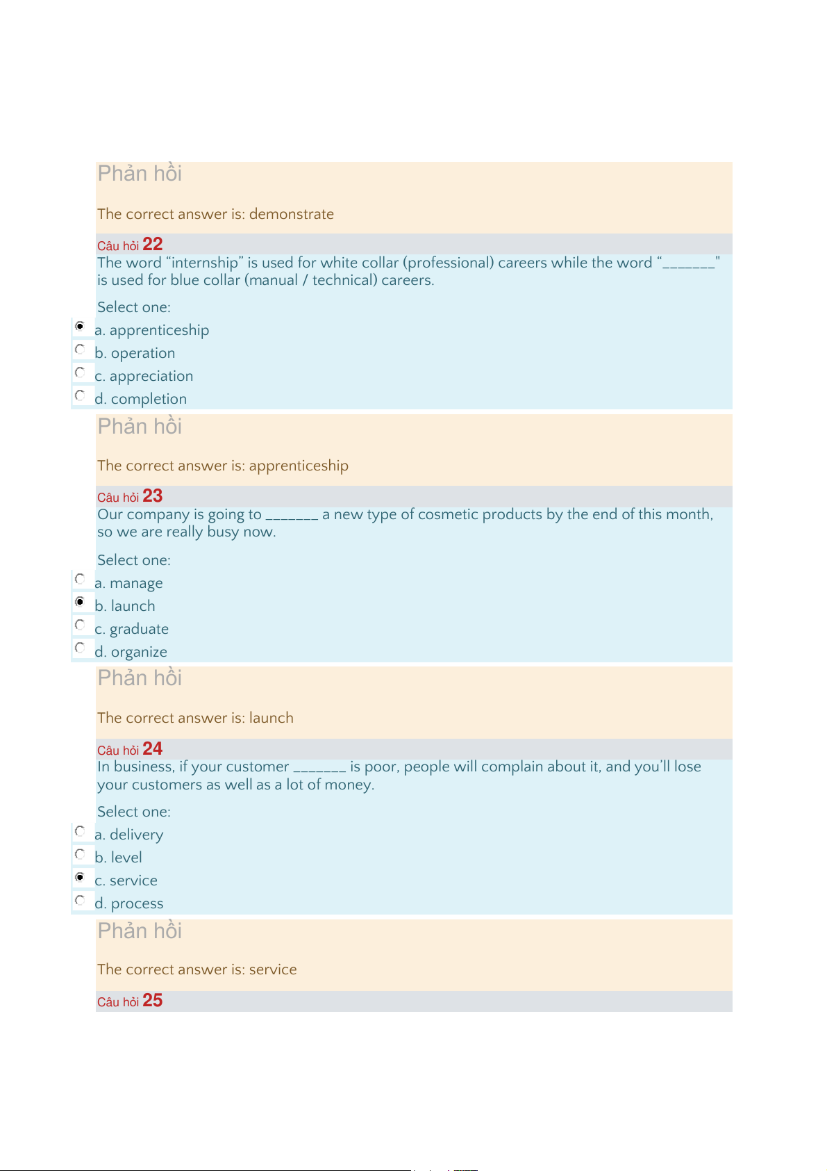 Our company is going to _______ a new type of cosmetic products by the end of this month, so we are really busy now. Select one: a. manage b. launch c. graduate d. organize Phản hồi The correct answer is: launch Câu hỏi 24