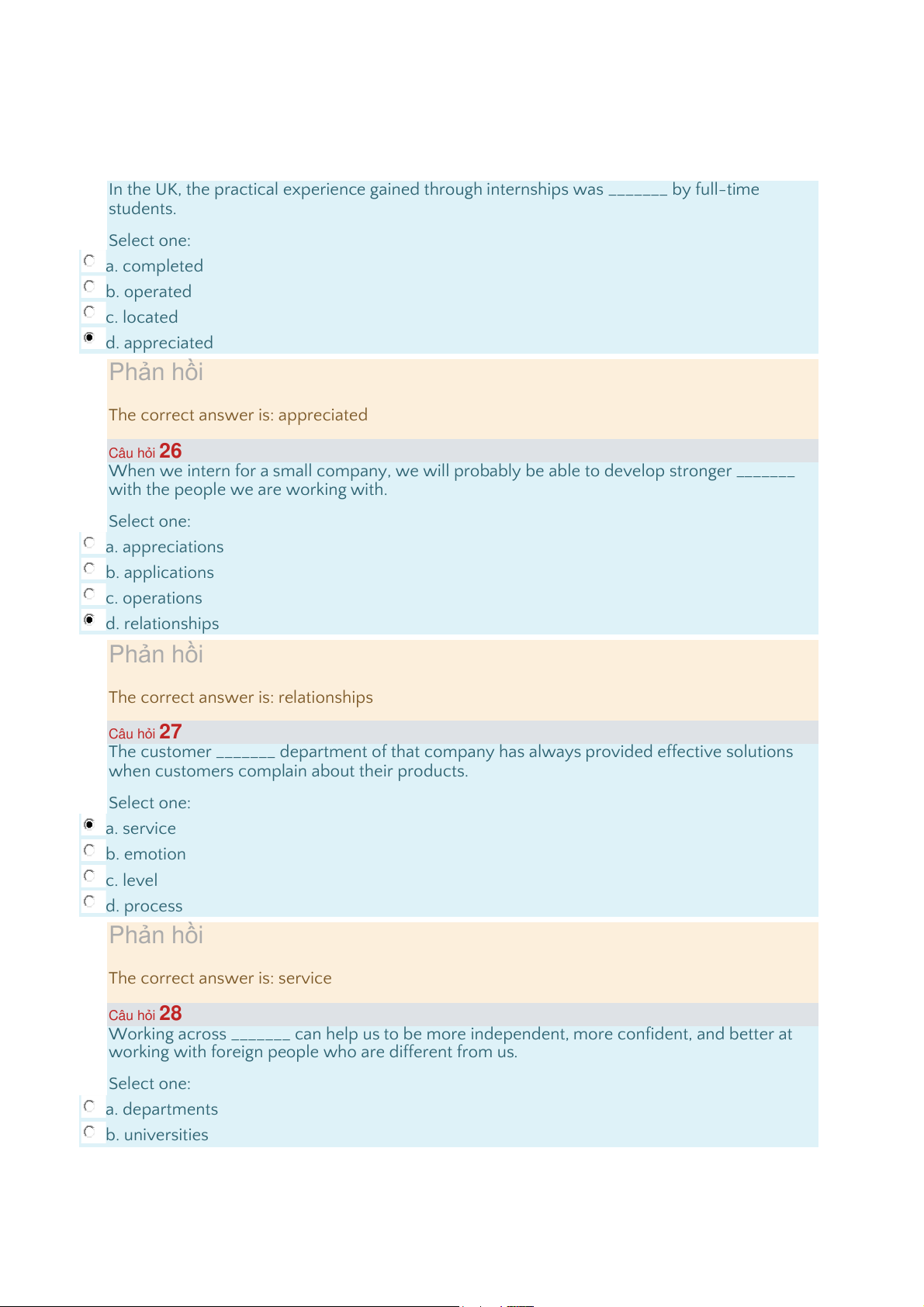 In the UK, the practical experience gained through internships was _______ by full-time students. Select one: a. completed b. operated c. located d. appreciated Phản hồi