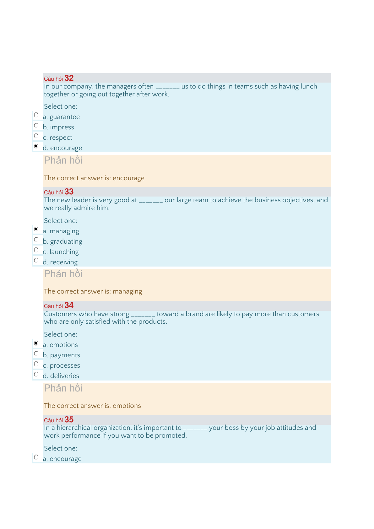 The new leader is very good at _______ our large team to achieve the business objectives, and we really admire him. Select one: a. managing b. graduating c. launching d. receiving Phản hồi