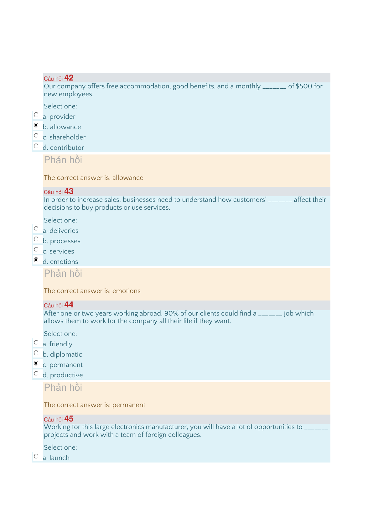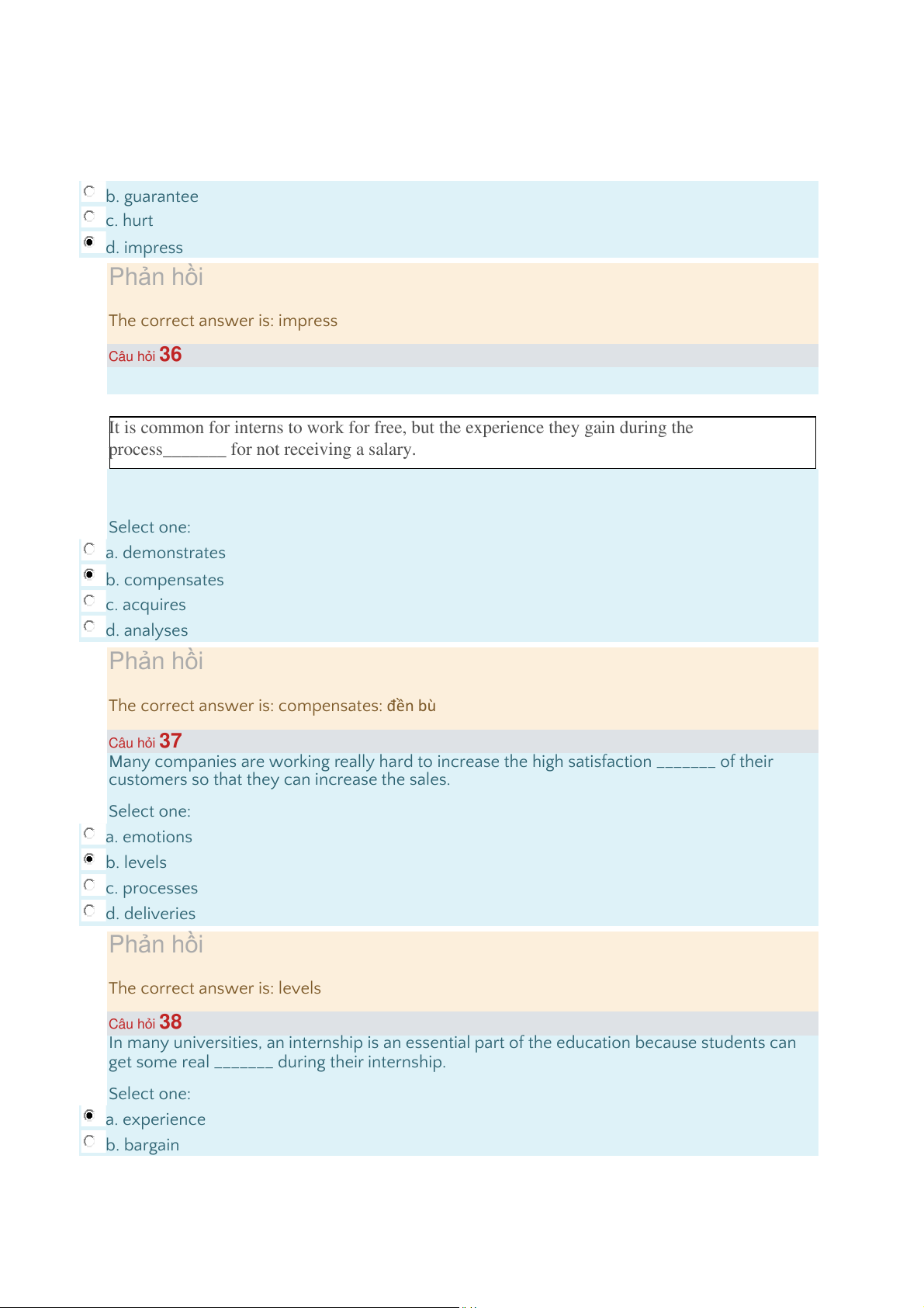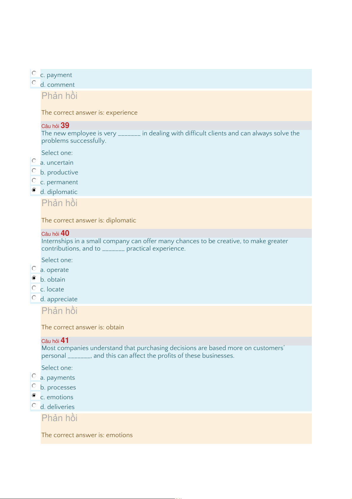contributions, and to _______ practical experience. Select one: a. operate b. obtain c. locate d. appreciate Phản hồi The correct answer is: obtain Câu hỏi 41