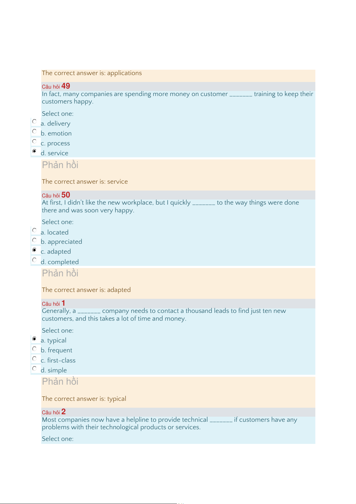In fact, many companies are spending more money on customer _______ training to keep their customers happy. Select one: a. delivery b. emotion c. process d. service Phản hồi