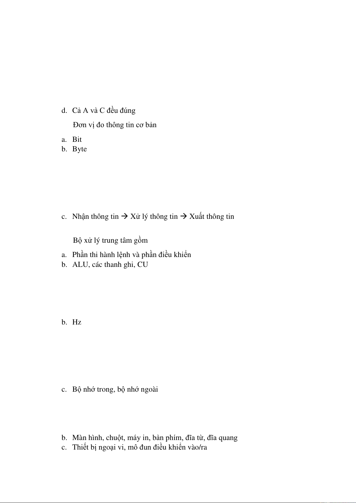 Câu 2. Đơn vị đo thông tin cơ bản trong máy tính là a. Bit b. Byte c. GB d. TB