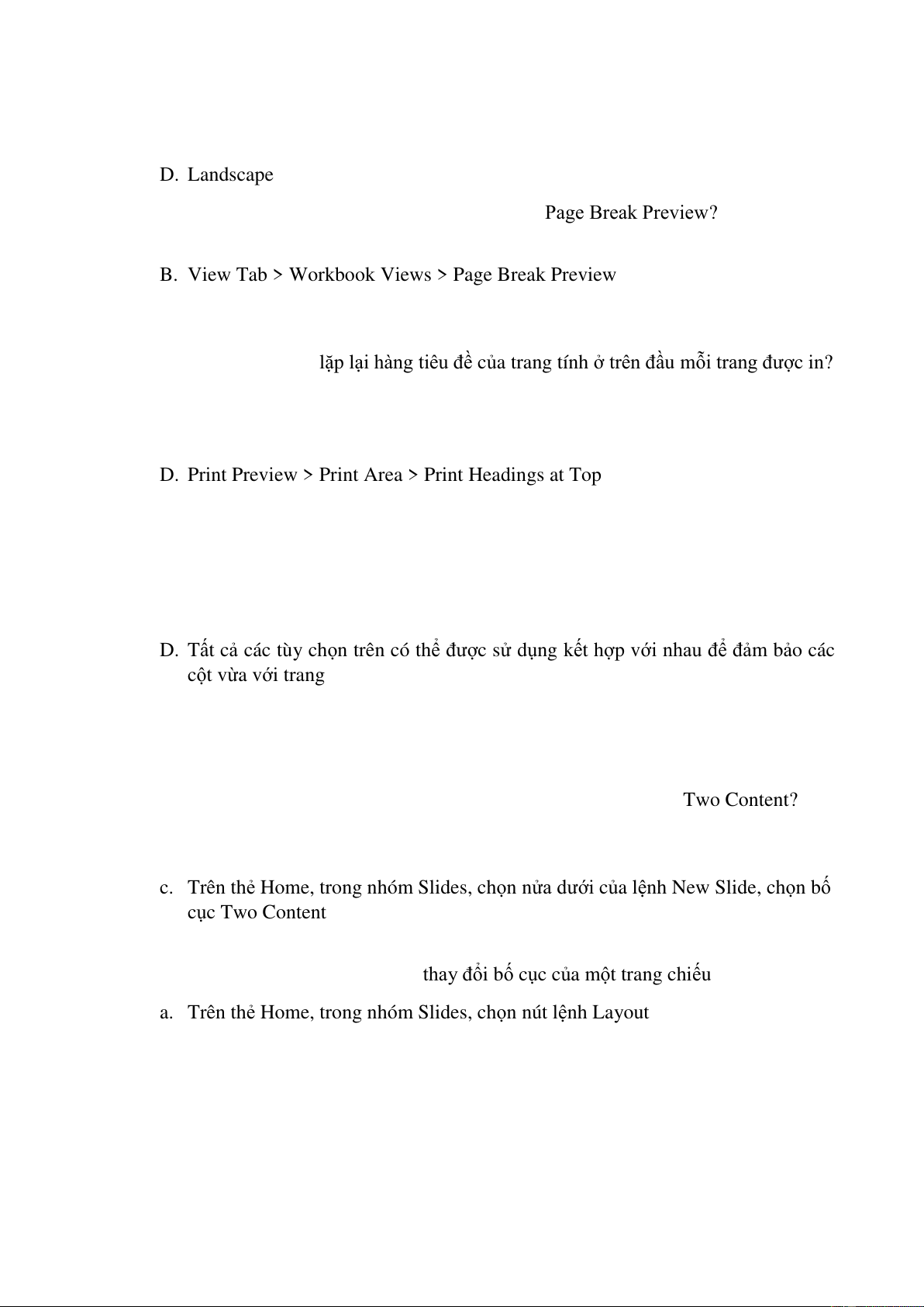 Câu 5. Lựa chọn nào sau đây để thay đổi bố cục của một trang chiếu