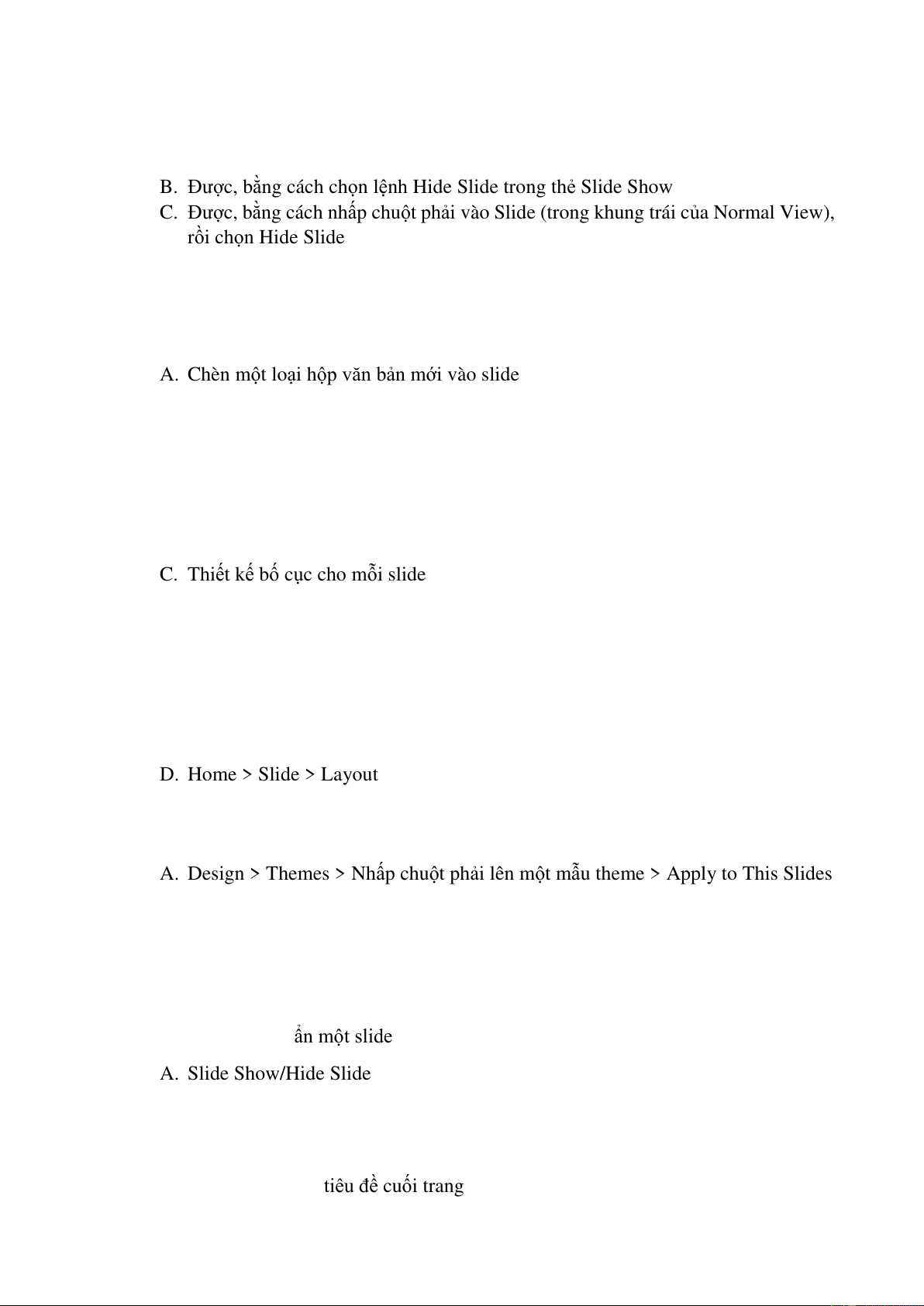 Câu 5. Cách nào để ẩn một slide đã được chọn? A. Slide Show/Hide Slide B. Edit/Hide Slide C. Format/Hide Slide D. Insert/Hide Slide