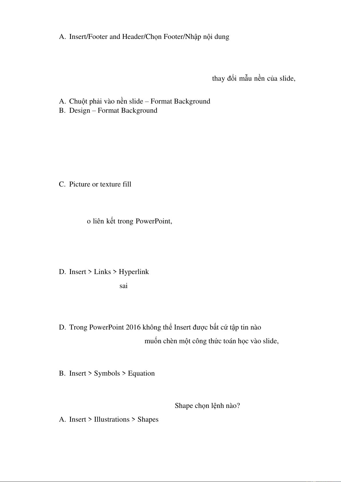 Câu 3. Trong PowerPoint 2016, muốn chèn một công thức toán học vào slide, thực hiện lệnh nào sau đây?