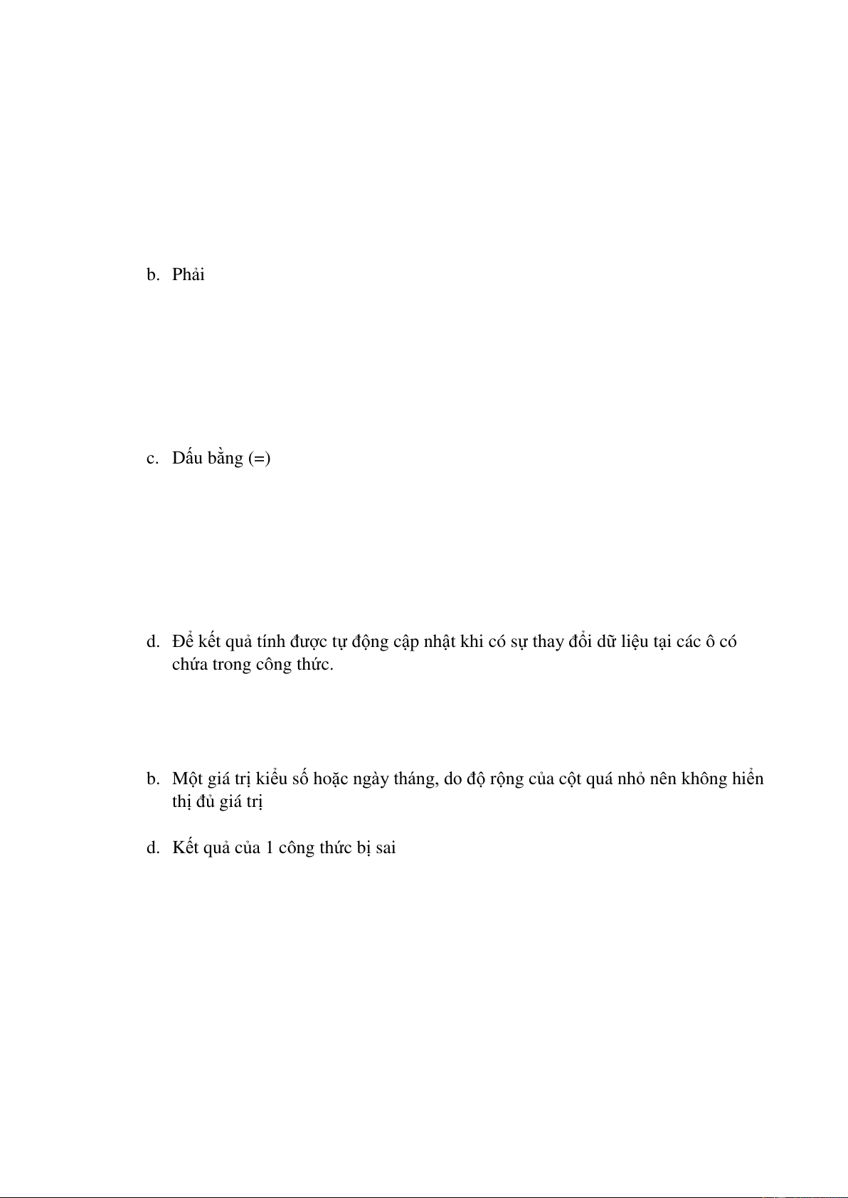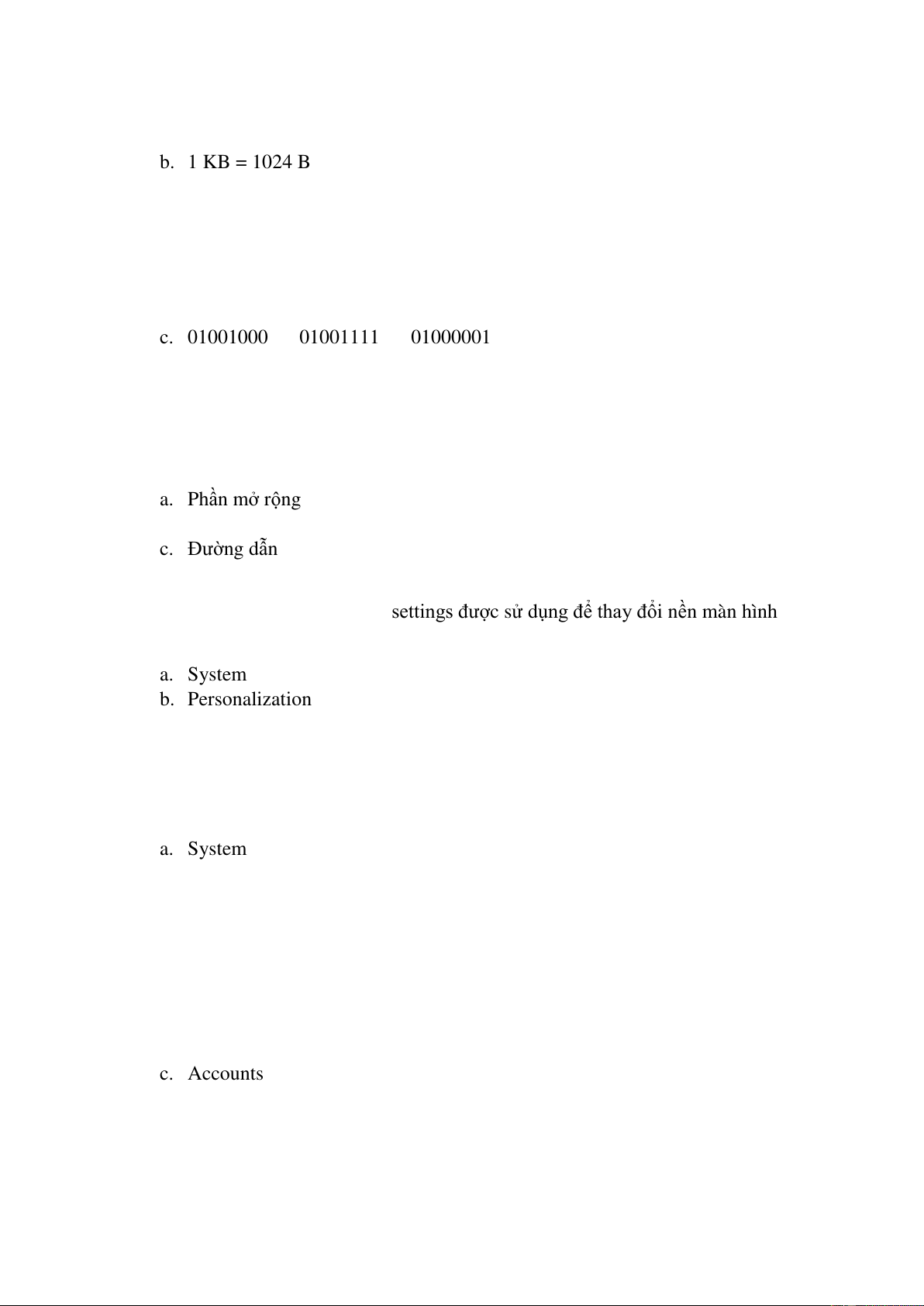 Câu 8. Chọn đáp án đúng a. 1 GB = 1000 MB b. 1 KB = 1024 B c. 1 TB = 1000000 MB d. 1 MB = 1000000 B
