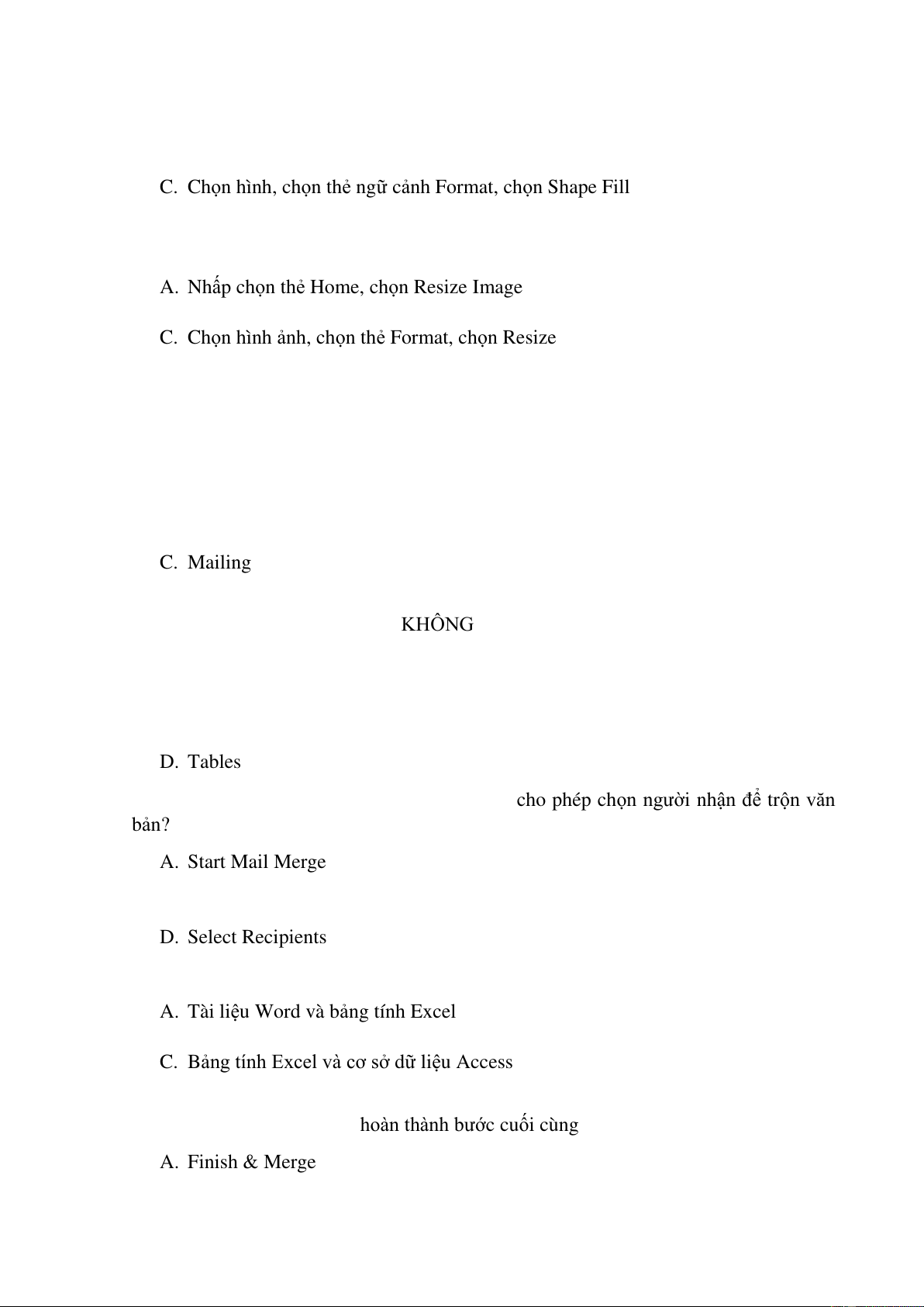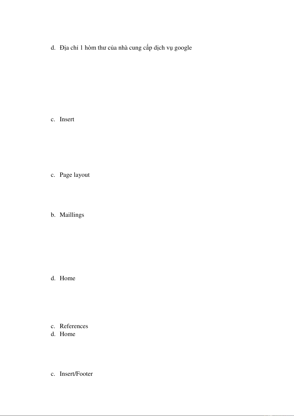 Câu 3. Thẻ nào chứa các lệnh trộn văn bản a. References b. Maillings c. Home d. Insert