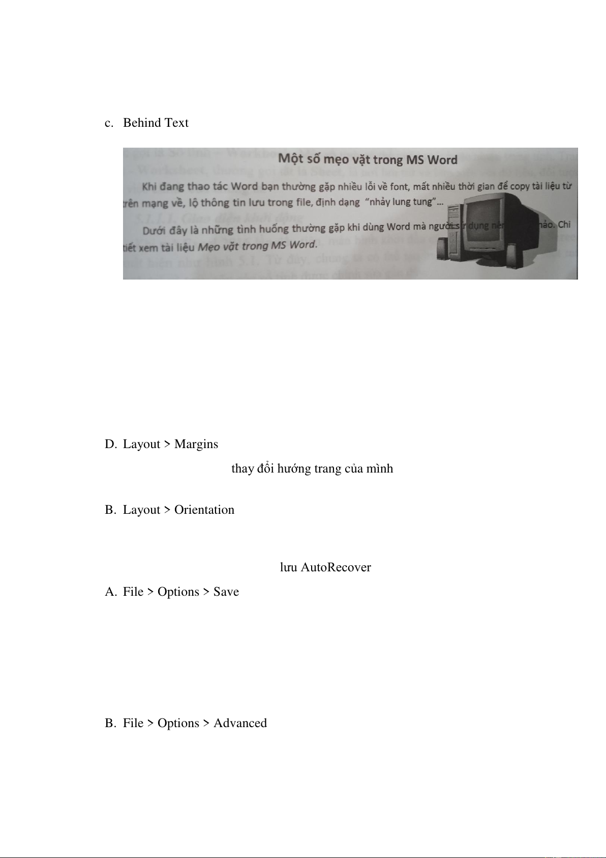 Câu 8. Trong hình minh họa, ảnh được xen vào phần văn bản theo kiểu nào a. Top and Bottom b. In Front of Text c. Behind Text d. Tight WORD 1.1.4. Câu hỏi ôn tập