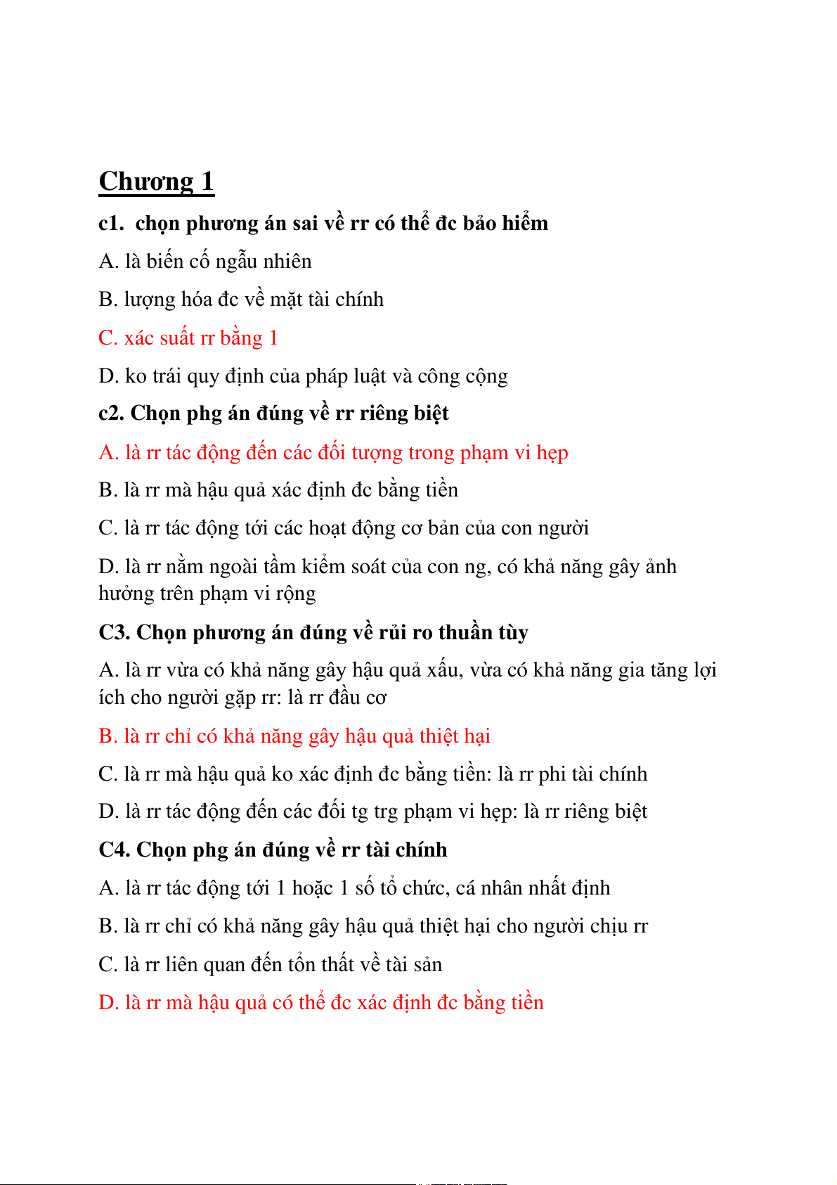 c1. chọn phương án sai rr c về ó th ể đc bảo hi m ể A. là bi n c ế ố ngẫu nhiên B. lượng hóa đc về m t ặ tài chính C. xác su t ấ rr b ng 1 ằ