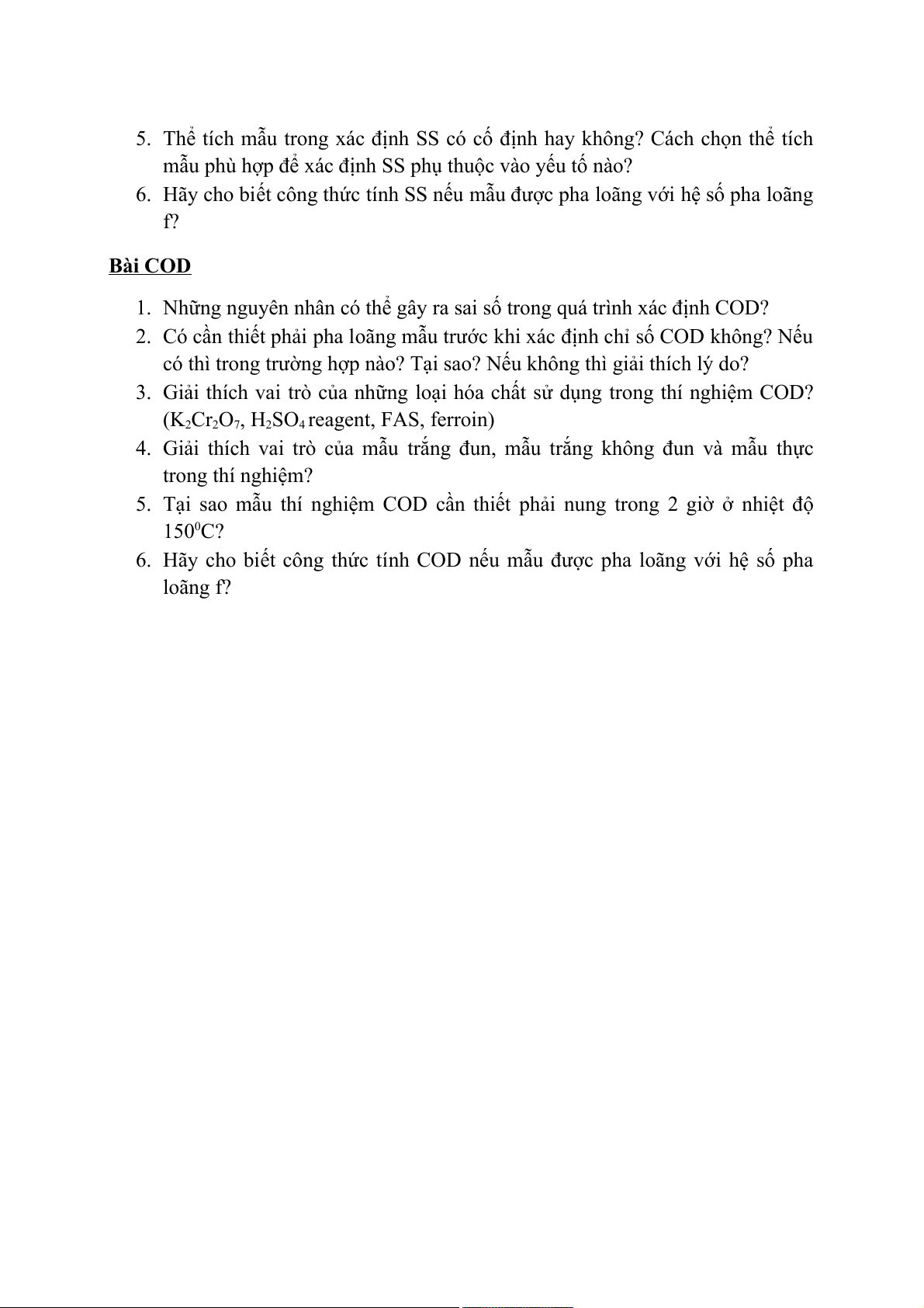 6. Hãy cho biết công thức tính SS nếu mẫu được pha loãng với hệ số pha loãng f? Bài COD