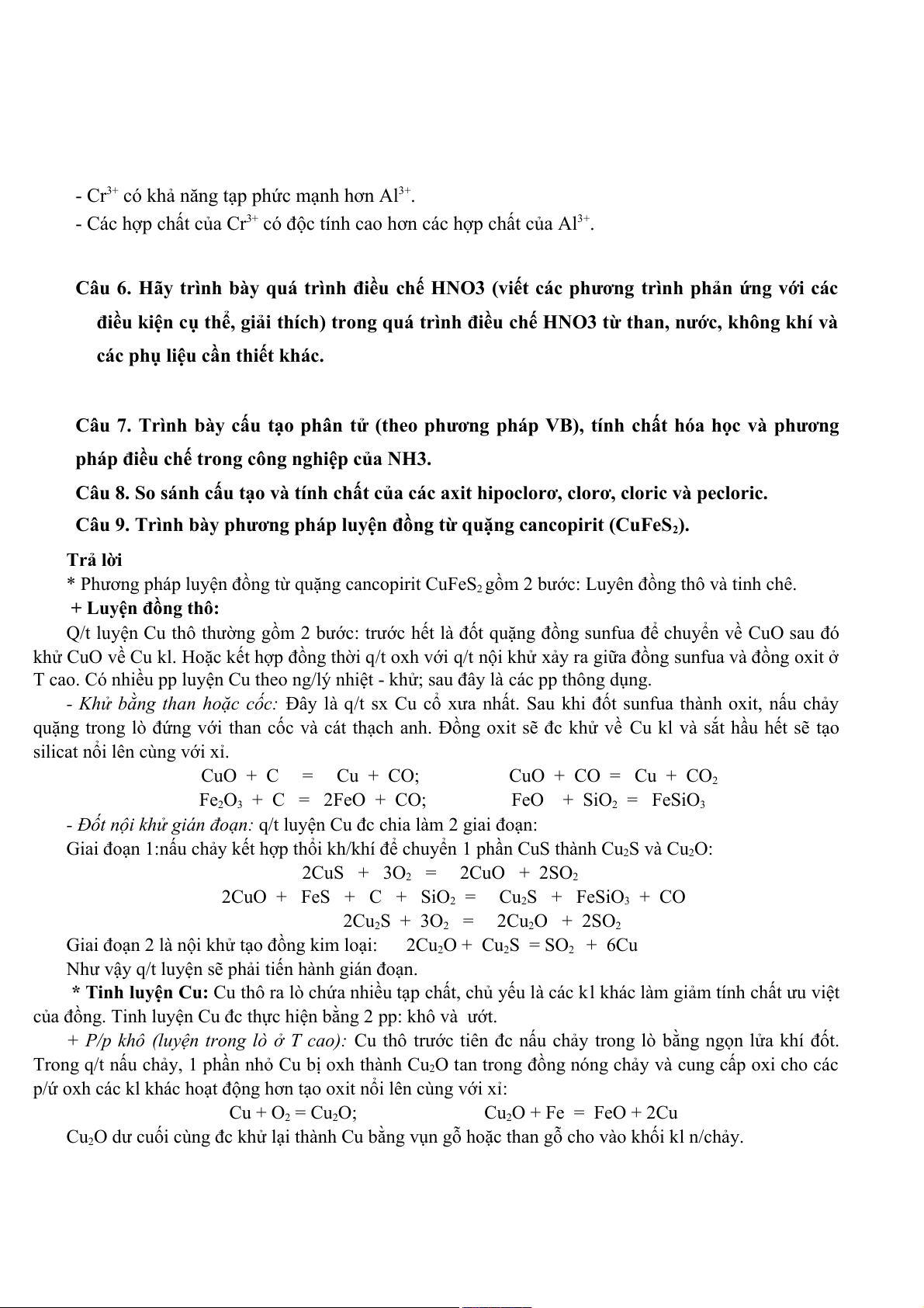 Câu 9. Trình bày phương pháp luyện đồng từ quặng cancopirit (CuFeS ). 2 Trả lời