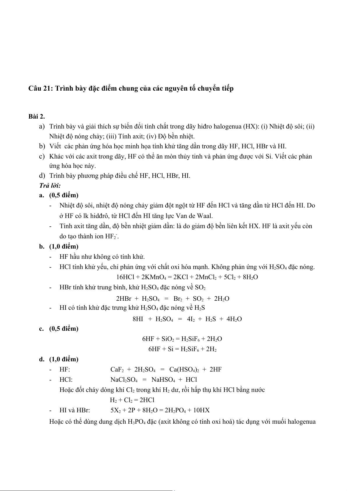 HI có tính khử đặc trưng khử H2SO đặc nóng về H 4 2S 8HI + H2SO = 4I 4 2 + H2S + 4H2O c. (0,5 điểm) 6HF + SiO = H 2 2SiF + 2H 6 O 2 6HF + Si = H2SiF + 2H 6 2 d. (1,0 điểm) - HF: CaF2 + 2H2SO = Ca(HSO 4 4) + 2HF 2 - HCl: NaCl2SO = NaHSO 4 + HCl 4