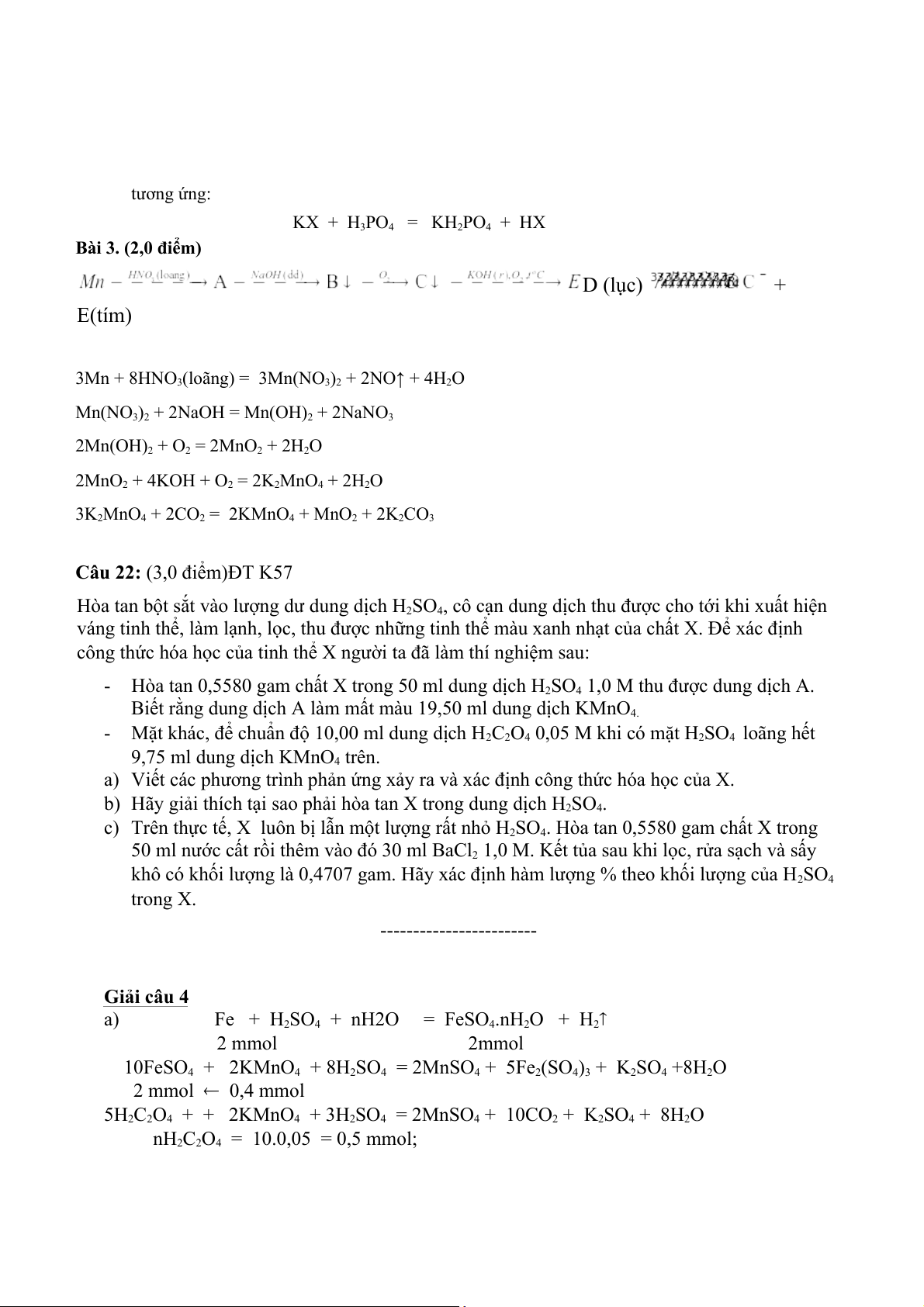 (axit không có tính oxi hoá) tác dụng với muối halogenua tương ứng: KX + H3PO = KH 4 2PO + HX 4 Bài 3. (2,0 điểm) D (lục) + E(tím) 3Mn + 8HNO (loãng) = 3Mn(NO 3 3) + 2NO↑ + 4H 2 O 2