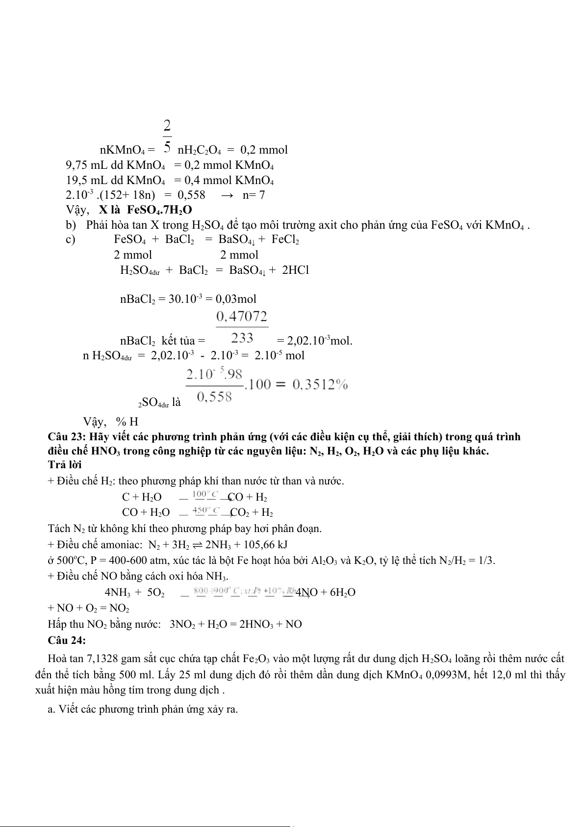b) Phải hòa tan X trong H2SO4 để tạo môi trường axit cho phản ứng của FeSO4 với KMnO4 . c) FeSO4 + BaCl = BaSO 2 + FeCl 4↓ 2 2 mmol 2 mmol H2SO4dư + BaCl = BaSO 2 + 2HCl 4↓ nBaCl -3 2 = 30.10 = 0,03mol nBaCl -3 2 kết tủa = = 2,02.10 mol. n H -3 -3 -5