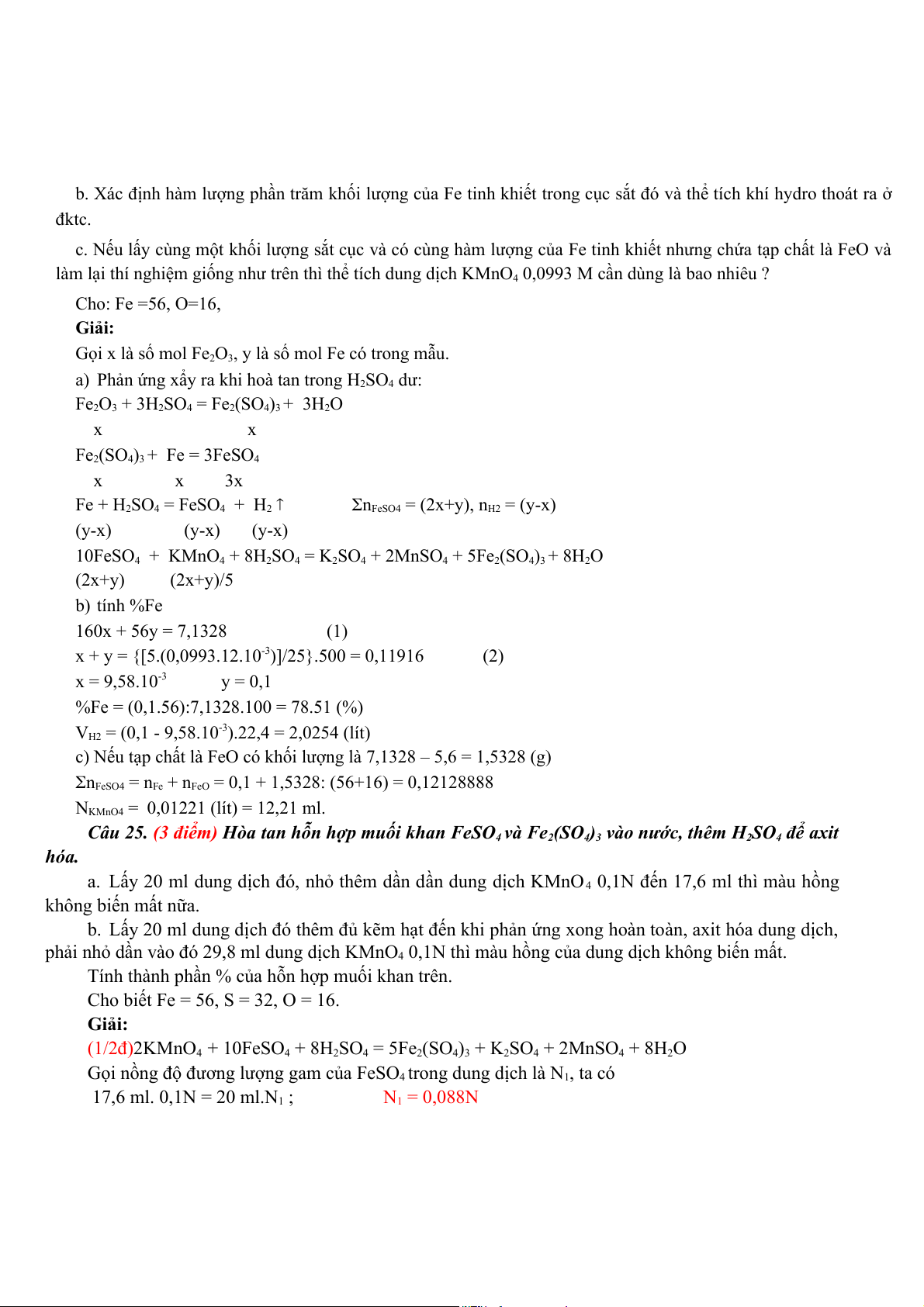 Câu 25. (3 điểm) Hòa tan hỗn hợp muối khan FeSO4 và Fe2(SO4)3 vào nước, thêm H2SO4 để axit hóa.