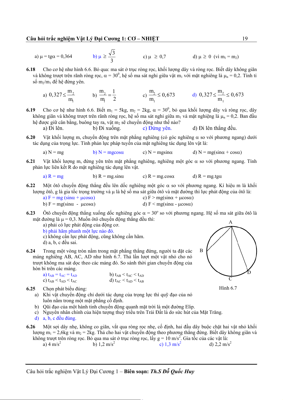 Câu hỏi trắc nghiệm Vật Lý Đại Cương 1: CƠ – NHIỆT 19 3 a) µ = tgα = 0,364 b) µ ≥ c) µ ≥ 0,7 d) µ ≥ 0 (vì m 3 1 = m2)