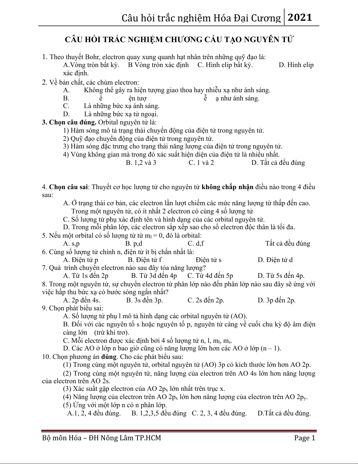 Câu hỏi trắc nghiệm Hóa Đại Cương 2021