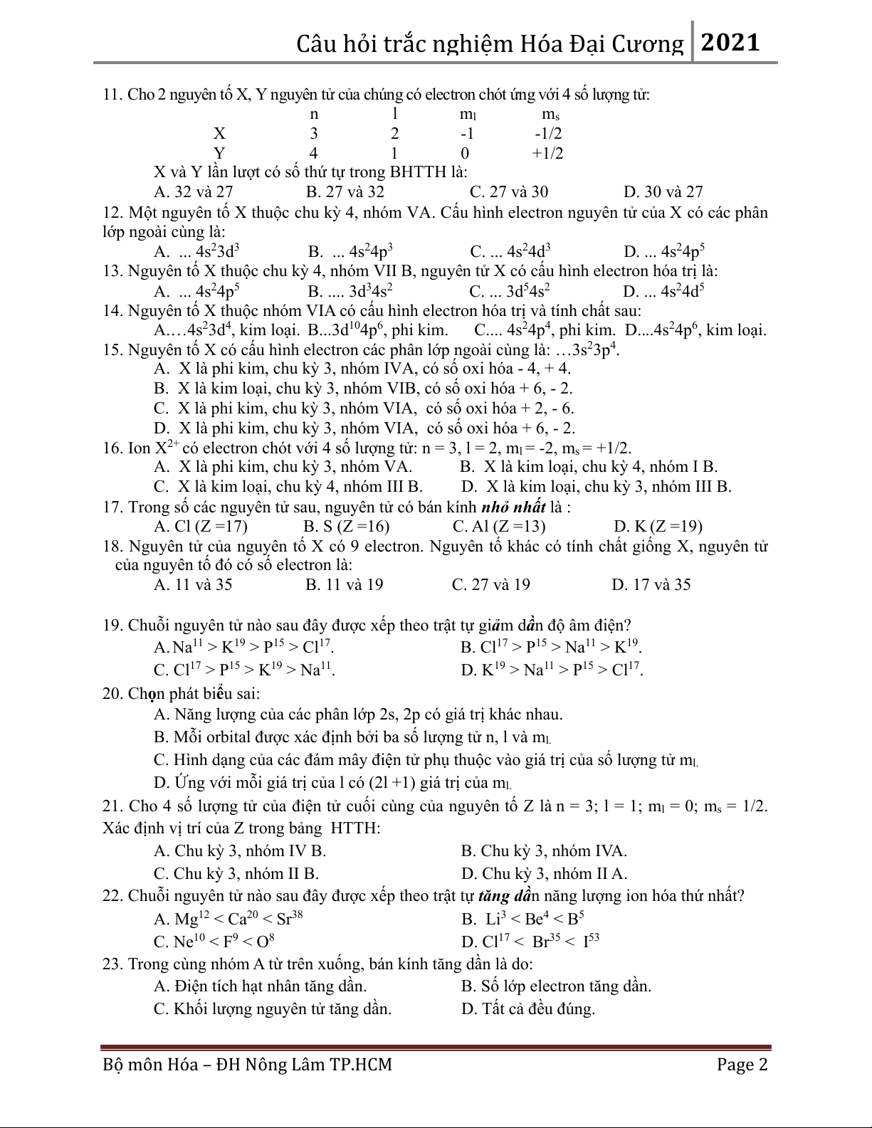 16. Ion X2+ có electron chót với 4 số lượng tử: n = 3, l = 2, ml = -2, ms = +1/2.