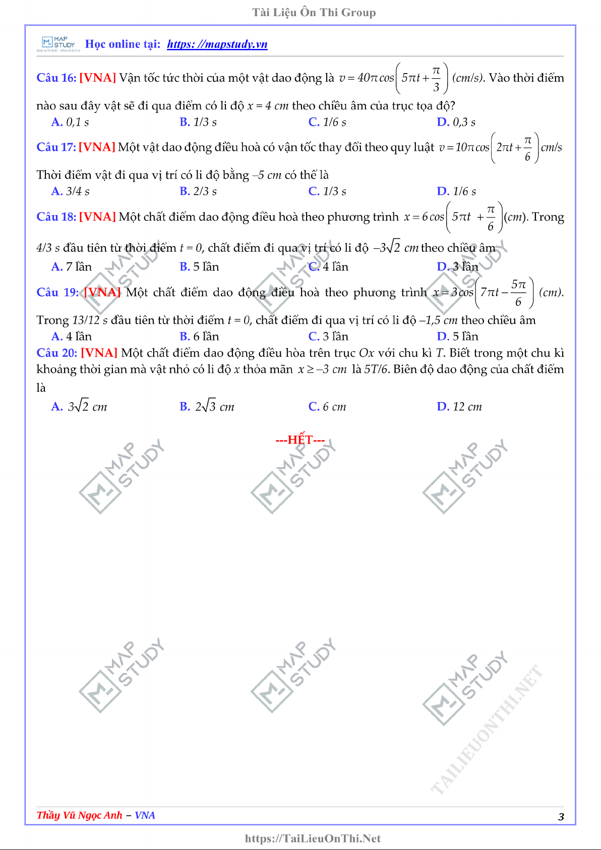 Câu hỏi trắc nghiệm Kĩ thuật vòng tròn lượng giác môn Vật lí 11