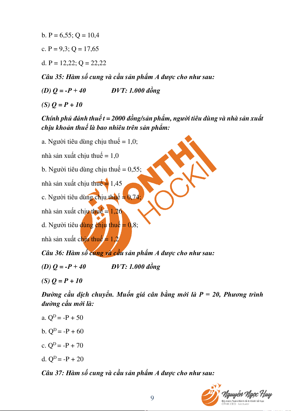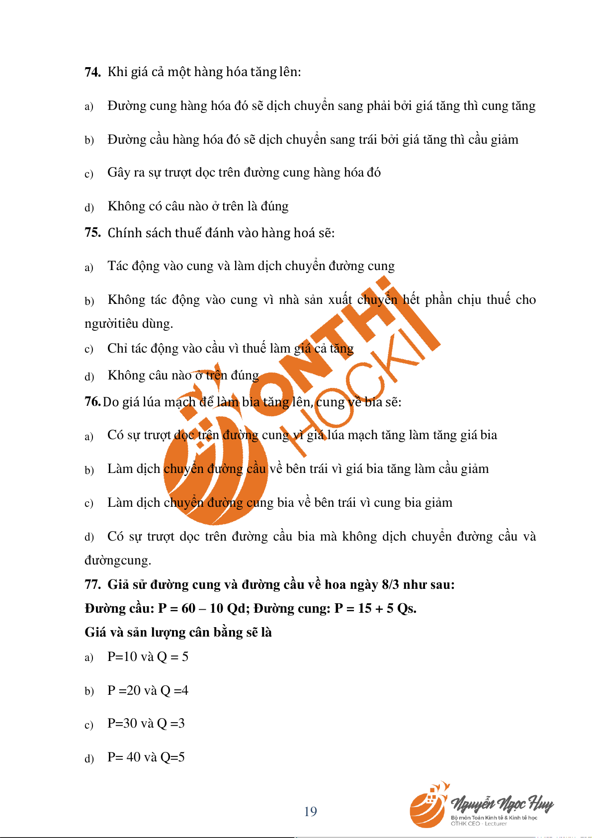 Giá và sản lượng cân bằng sẽ là a) P=10 và Q = 5 b) P =20 và Q =4 c) P=30 và Q =3 d) P= 40 và Q=5 19