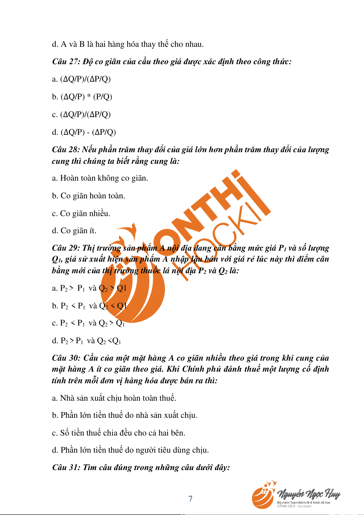 Câu 27: Độ co giãn của cầu theo giá được xác định theo công thức: a. (∆Q/P)/(∆P/Q) b. (∆Q/P) * (P/Q) c. (∆Q/P)/(∆P/Q) d. (∆Q/P) - (∆P/Q)