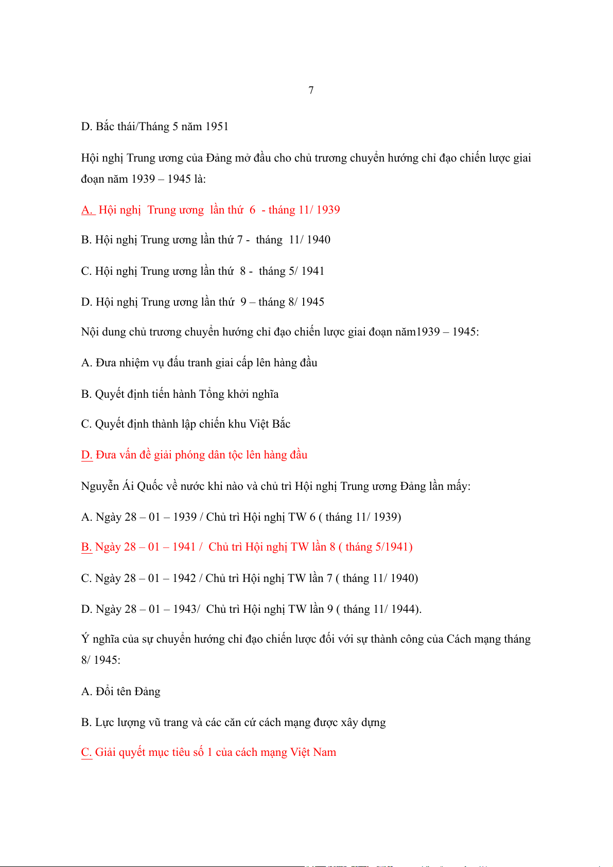 đoạn năm 1939 – 1945 là: A. Hội nghị T n th rung ương lầ 6 - tháng 1 ứ 1/ 1939 B. H i ngh ộ ị T n th rung ương lầ ứ 7 - tháng 11/ 1940 C. H i ngh ộ ị T n th rung ương lầ ứ 8 - tháng 5/ 1941 D. H i ngh ộ ị T n th rung ương lầ 9 ứ tháng 8/ 1945 –