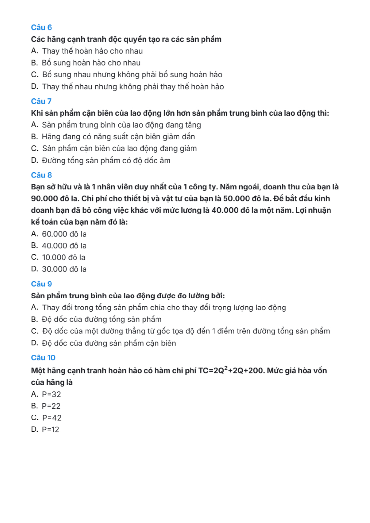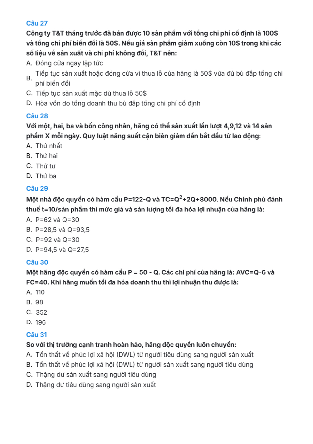 Câu hỏi trắc nghiệm môn Kinh tế vi mô | Trường Đại học Kinh Tế Quốc Dân