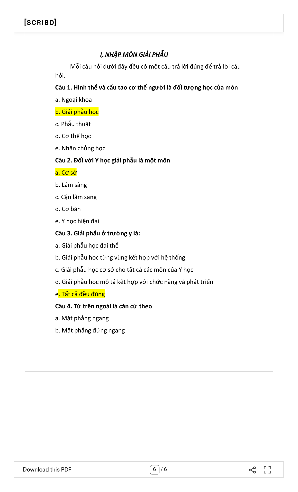 Câu 4. Từ trên ngoài là căn cứ theo a. Mặt phẳng ngang b. Mặt phẳng đứng ngang Download this PDF 6 / 6 c. Mặt phẳng đứng dọc d. a và b đung e. a và c đúng