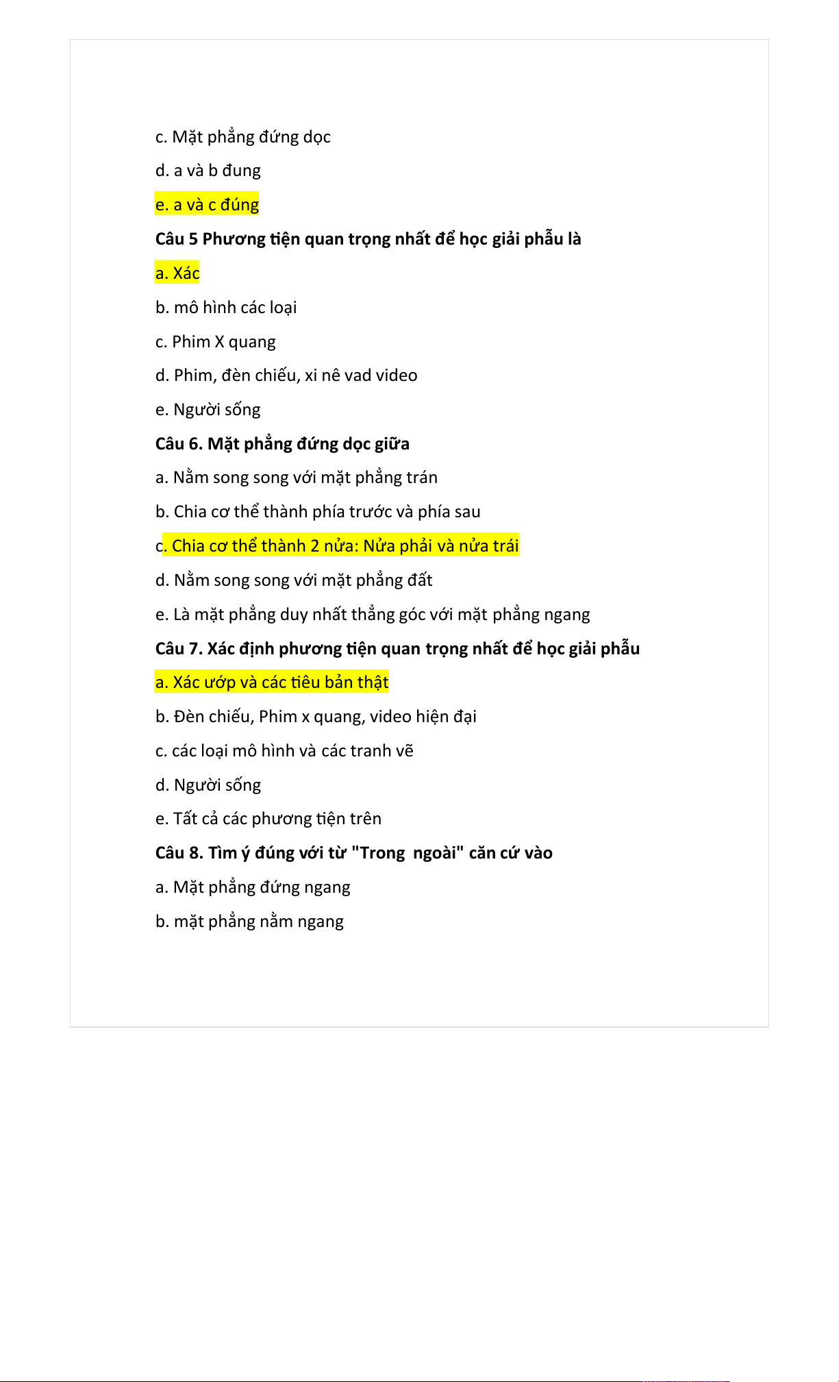 Câu 5 Phương ện quan trọng nhất để học giải phẫu là a. Xác b. mô hình các loại c. Phim X quang