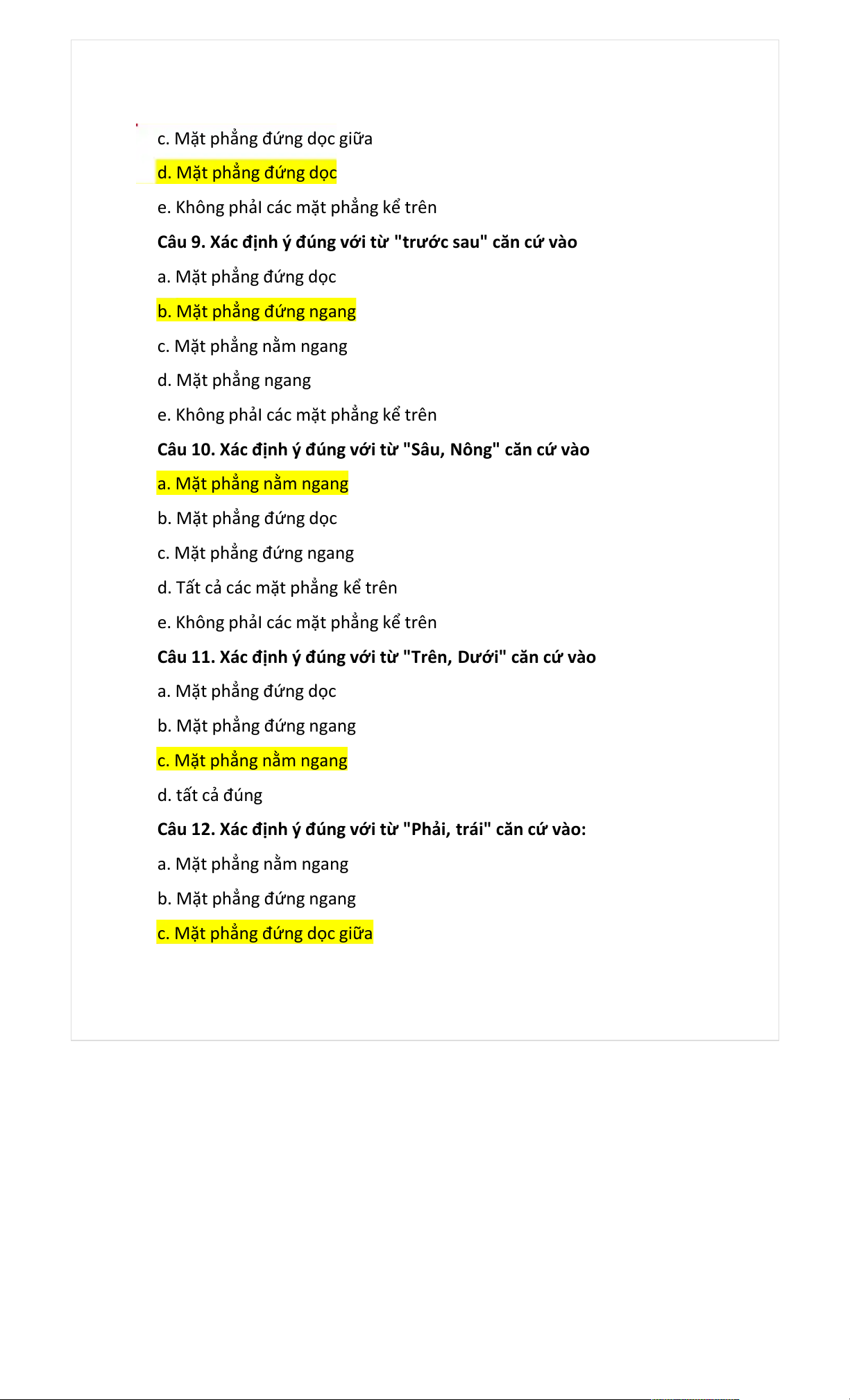 Câu 9. Xác định ý đúng với từ "trước sau" căn cứ vào a. Mặt phẳng đứng dọc b. Mặt phẳng đứng ngang c. Mặt phẳng nằm ngang d. Mặt phẳng ngang
