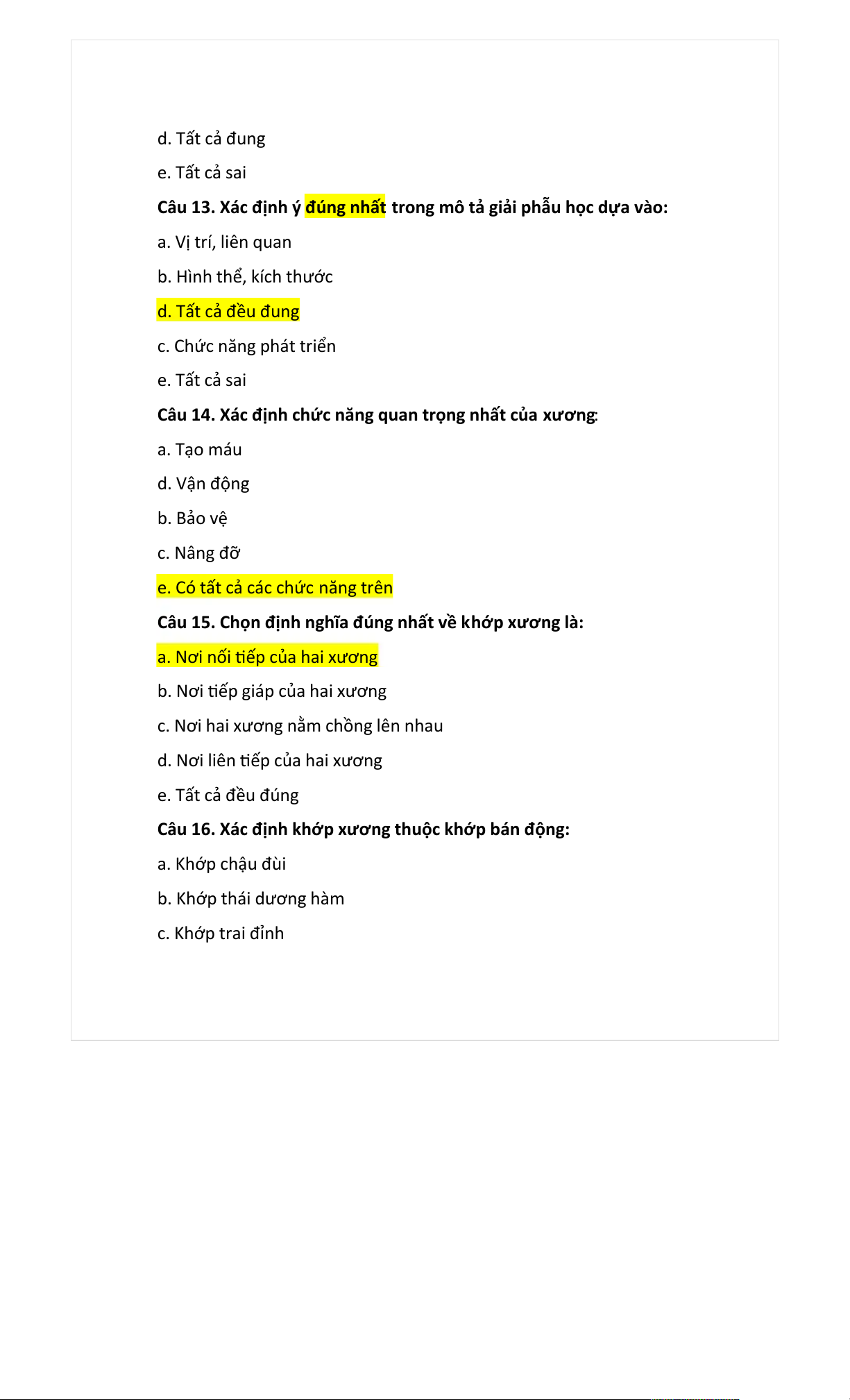 Câu 16. Xác định khớp xương thuộc khớp bán động: a. Khớp chậu đùi b. Khớp thái dương hàm c. Khớp trai đỉnh d. Khớp cùng chậu e. Tất cả đều đúng