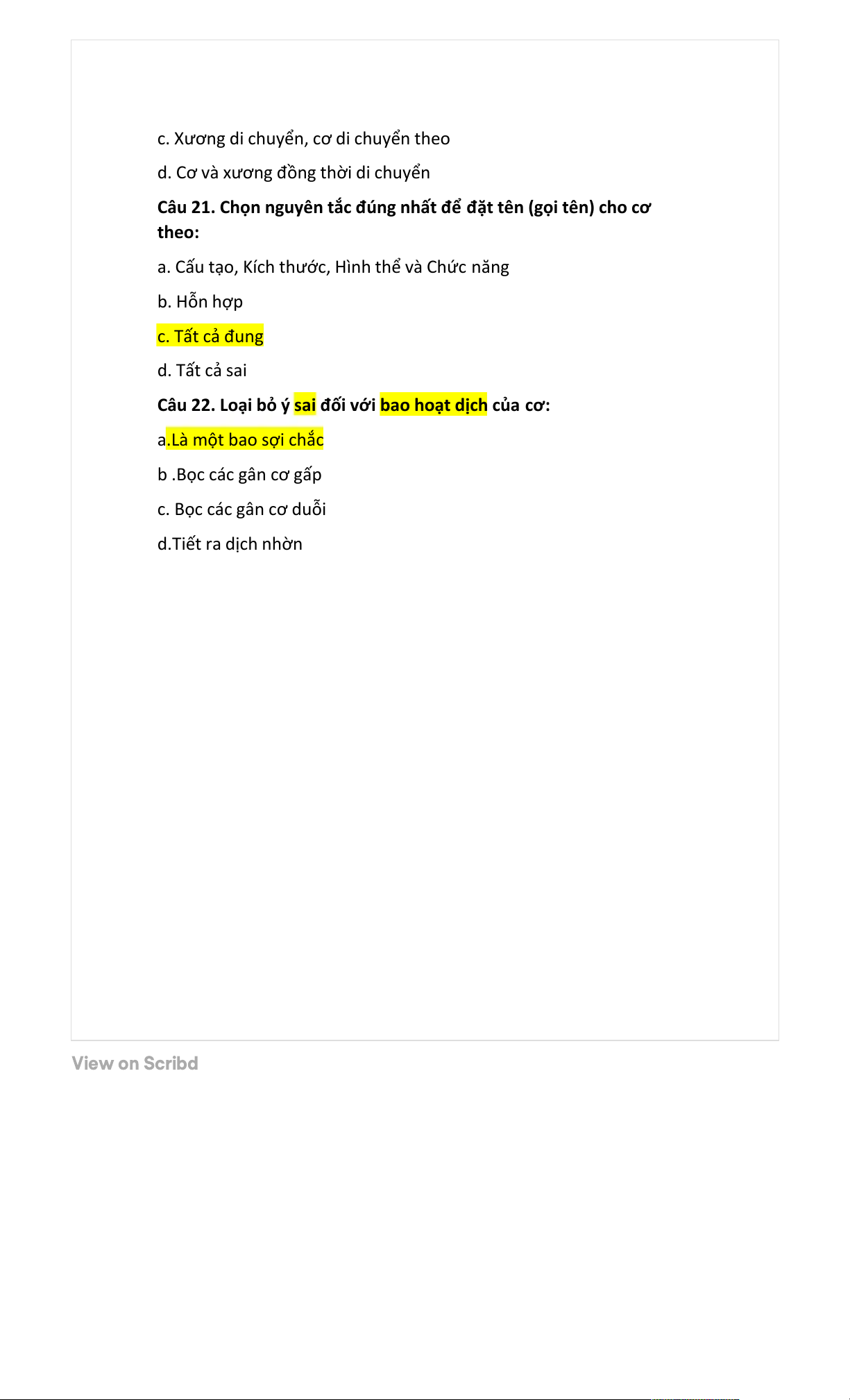 Câu 22. Loại bỏ ý sai đối với bao hoạt dịch của cơ: a.Là một bao sợi chắc b .Bọc các gân cơ gấp c. Bọc các gân cơ duỗi d.Tiết ra dịch nhờn View on Scribd