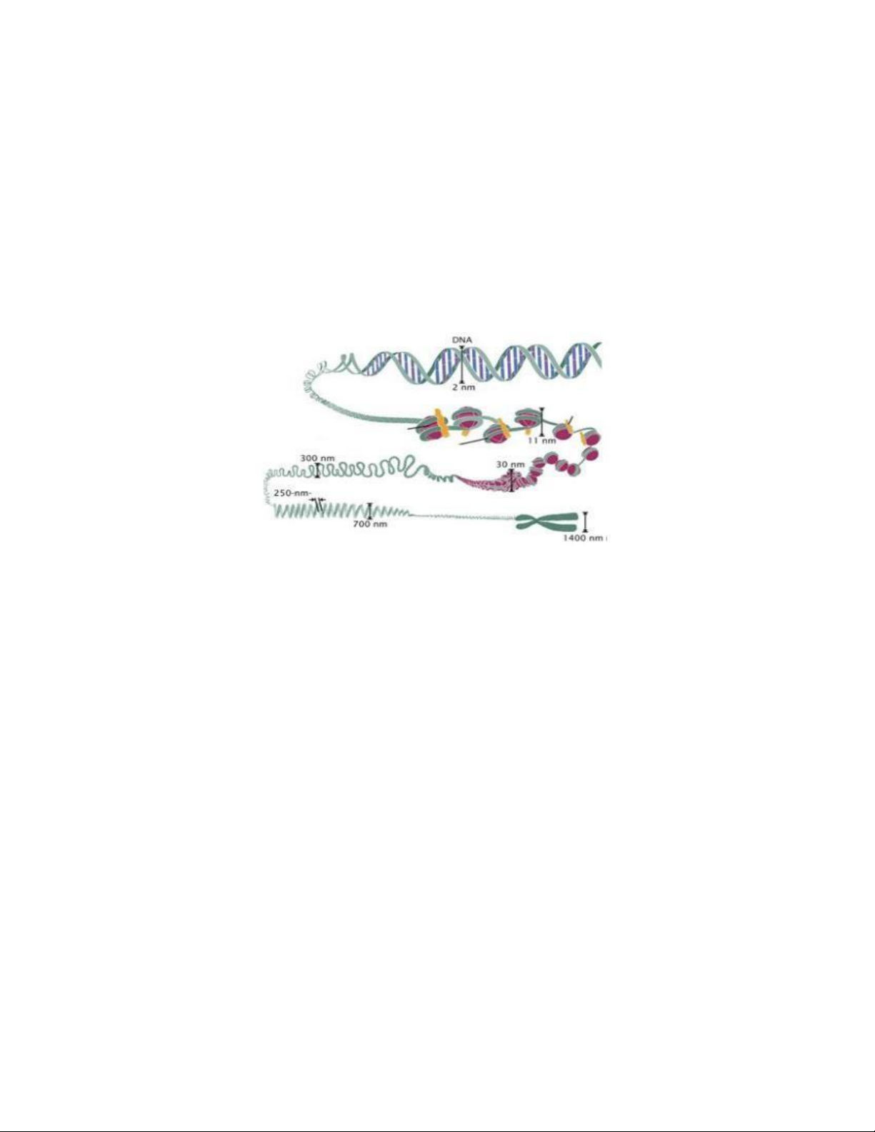 Mỗi nucleosome gồm một đoạn DNA có khoảng 146 cặp nucleotide quấn 1 vòng quanh một khối cầu gồm 8 phân tử histon. c.