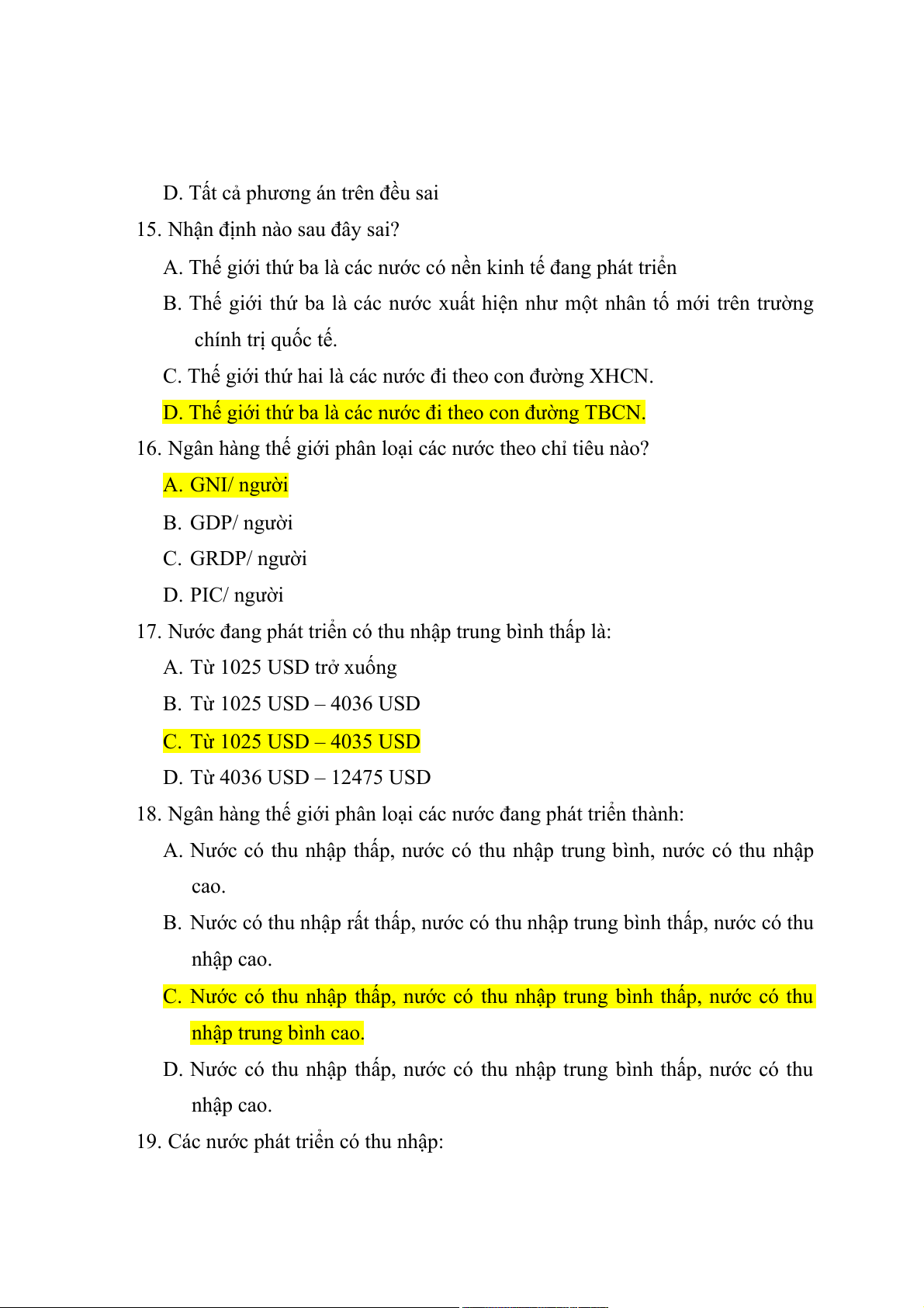 17. Nước đang phát triển có thu nhập trung bình thấp là: A. Từ 1025 USD trở xuống B. Từ 1025 USD – 4036 USD C. Từ 1025 USD – 4035 USD D. Từ 4036 USD – 12475 USD