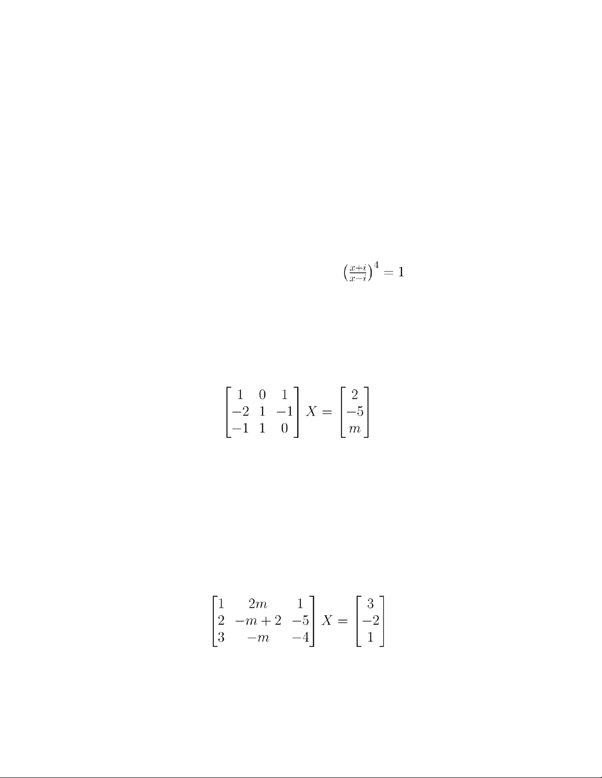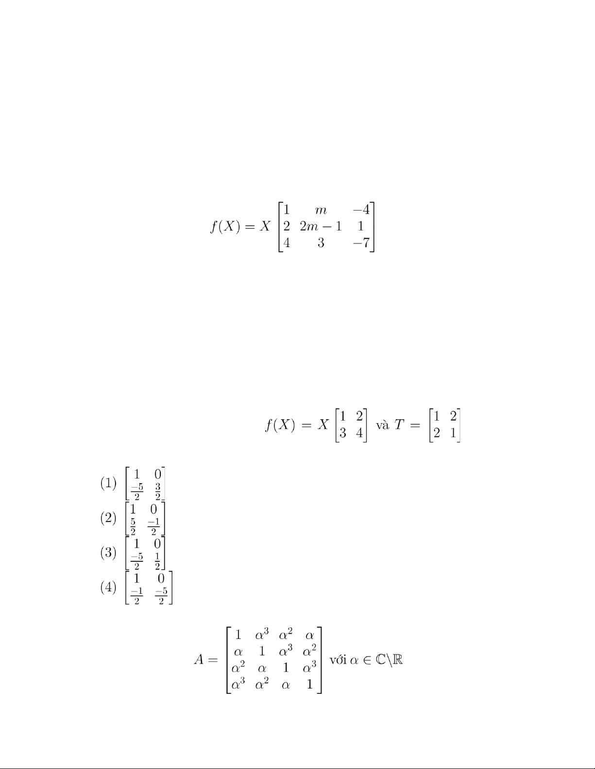 Câu 18. Phương trình ma trận có nghiệm khi (1) m = 1 (2) m = 5 (3) m = 3 (4) m = −3 (5) m = 2 (6) Một đáp án khác.