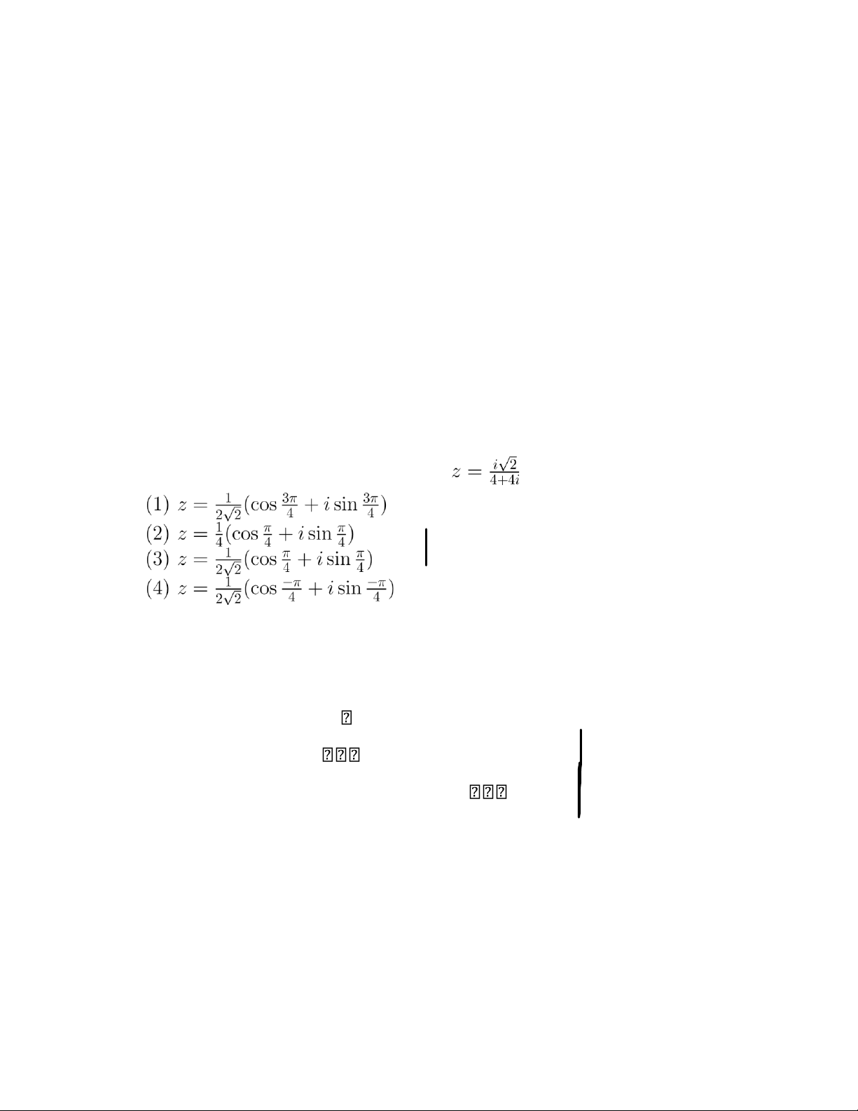 với n ∈ N. Khi đó n > 0 nhỏ nhất để Re(zn) = 0 là: (1) n = 5 1 (2) n = 6 (3) n = 2 (4) n = 3 (5) Một đáp án khác