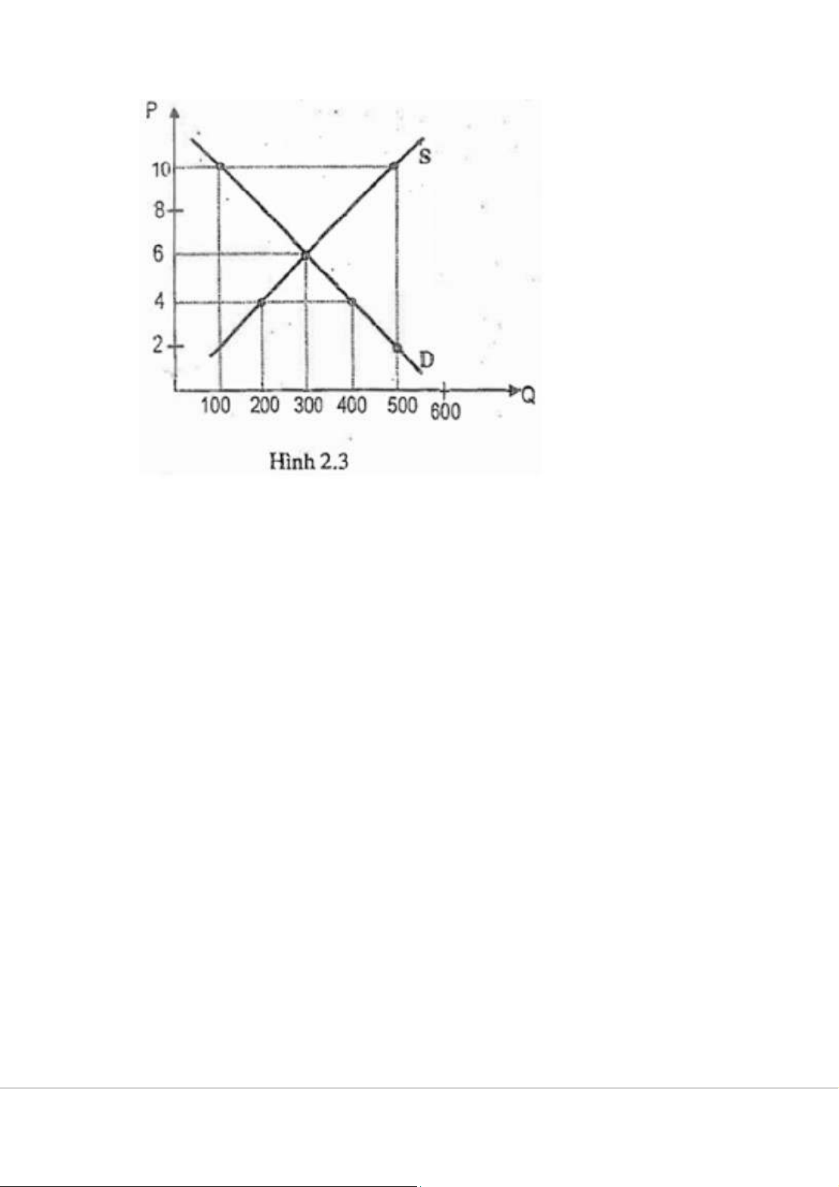 Câu 79: Theo hình 2.3, giá và sản lượng cân bằng là: A. P=6 và Q=300 B. P=4 và Q=400 C. P=10 và Q=100 D. P=2 và Q=100