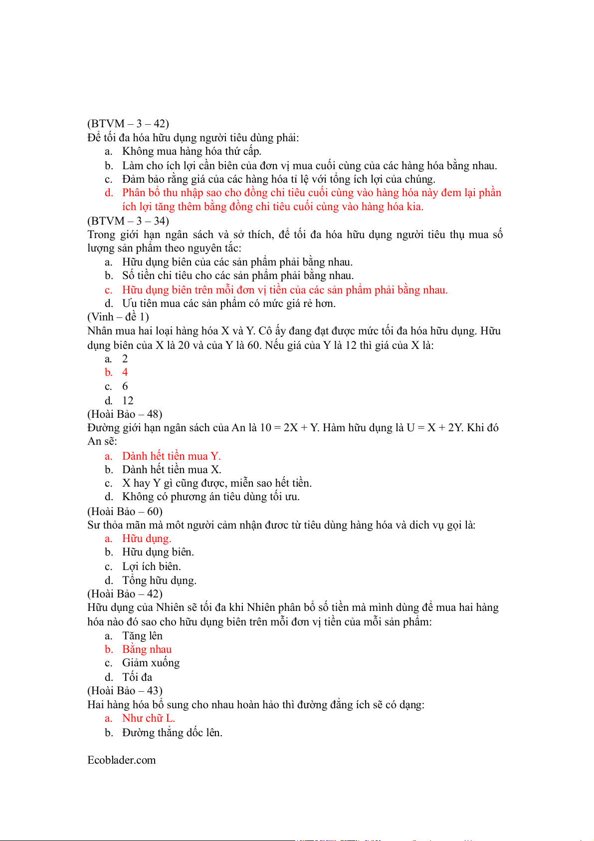 hóa nào đó sao cho hữu dụng biên trên mỗi đơn vị tiền của mỗi sản phẩm: a. Tăng lên b. Bằng nhau c. Giảm xuống d. Tối đa (Hoài Bảo – 43)
