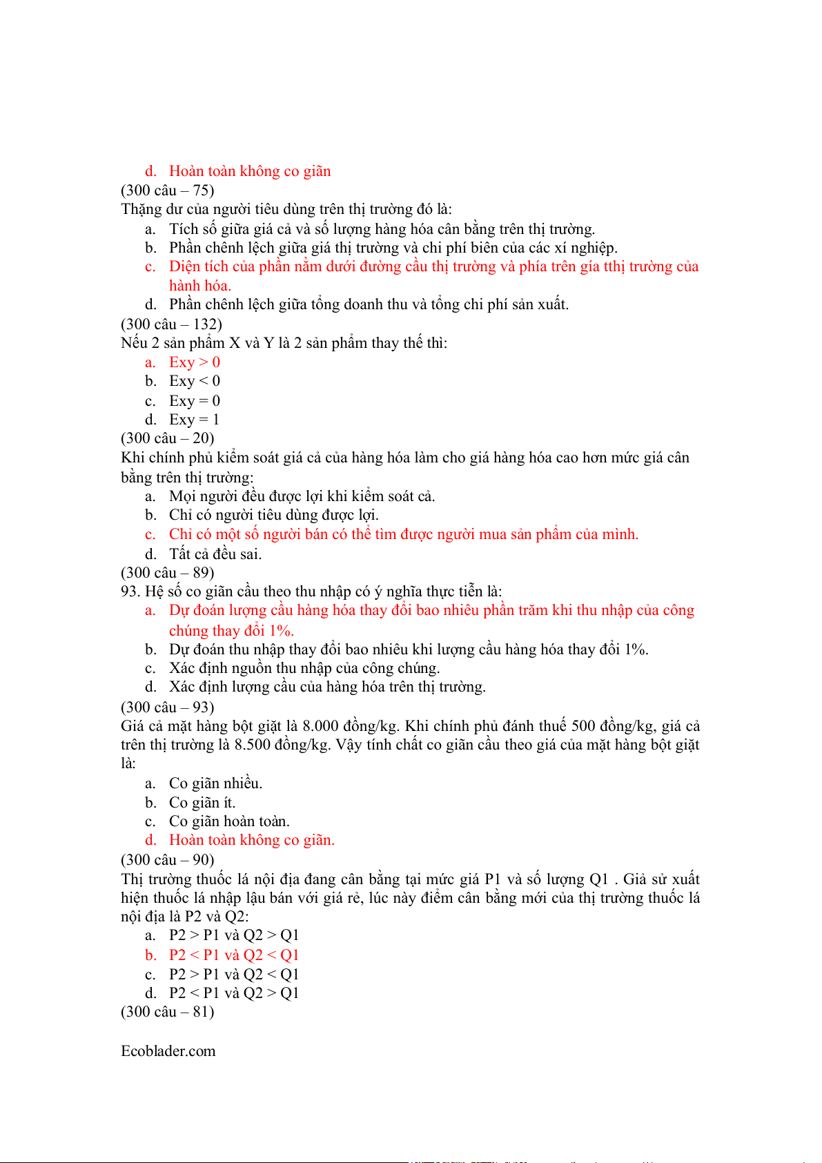 phẩm cân bằng mua và bán trên thị trường, chúng ta kết luận rằng cầu sản phẩm X: a. Co giãn nhiều b. Co giãn ít c. Co giãn đơn vị Ecoblader.com d. Hoàn toàn không co giãn (300 câu – 75)